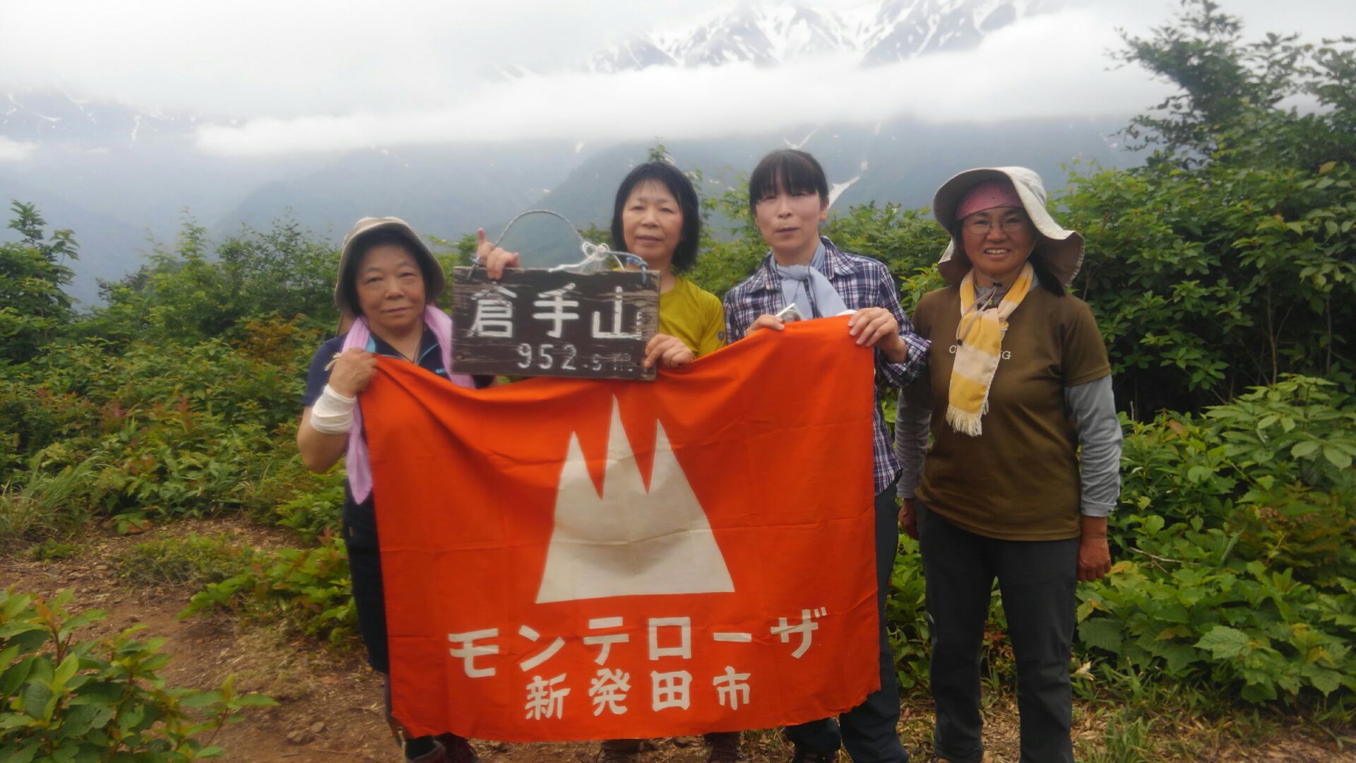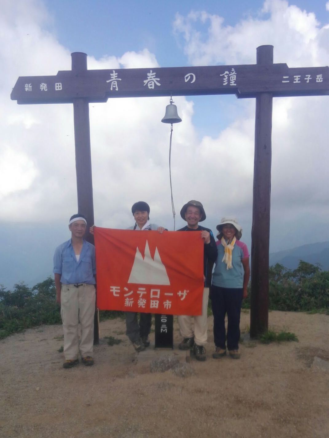 10:20山頂到着。前方には朝日連峰が見えます。が、後ろの飯豊連峰は残念ながら雲に隠れて姿を見せてくれませんでした。早速モンテローザの旗を広げて記念撮影会。昼食は次々にご馳走が回って来て食べる暇もない位でした。消費したカロリーの3倍は摂取してしまいました。
