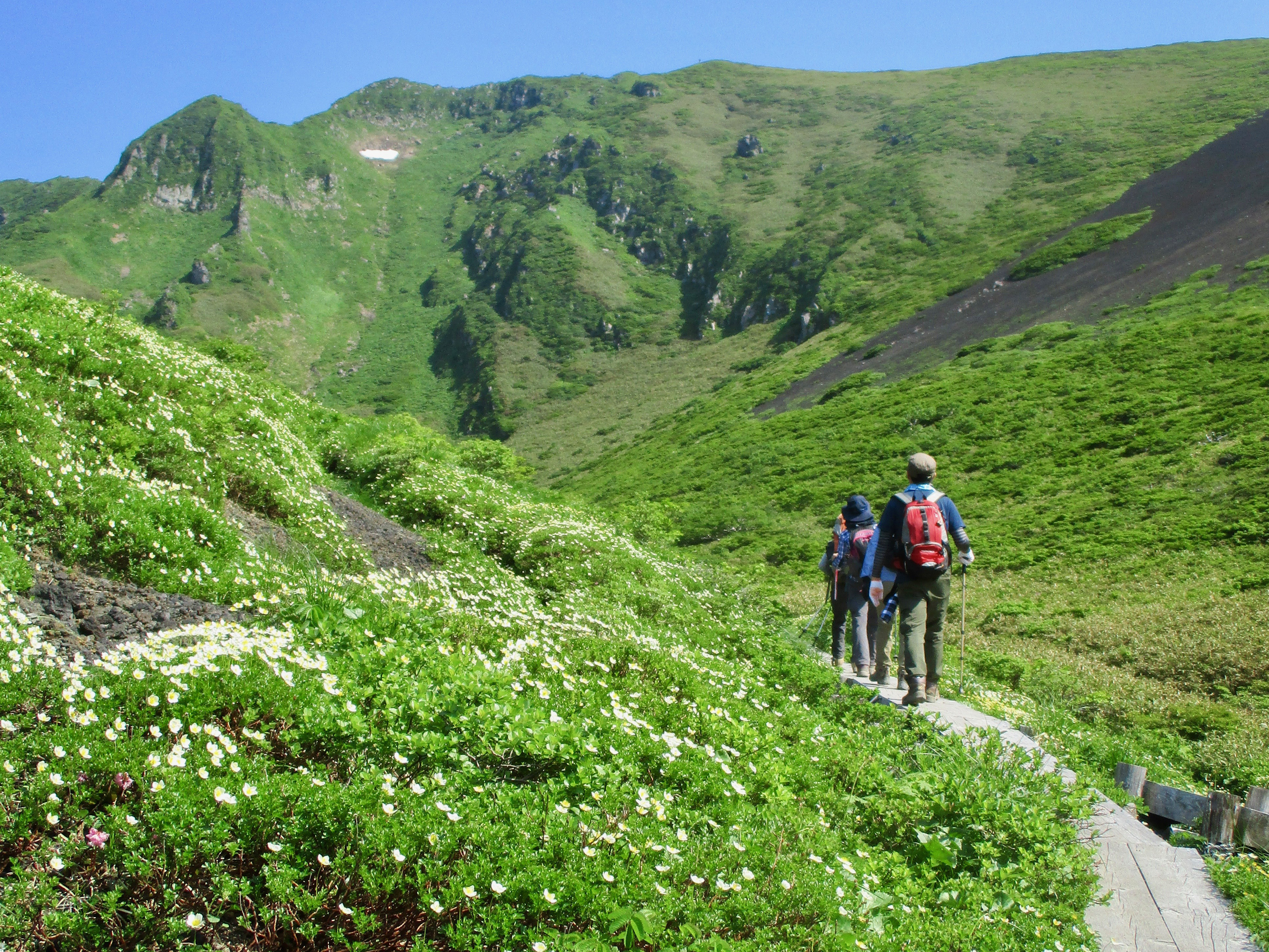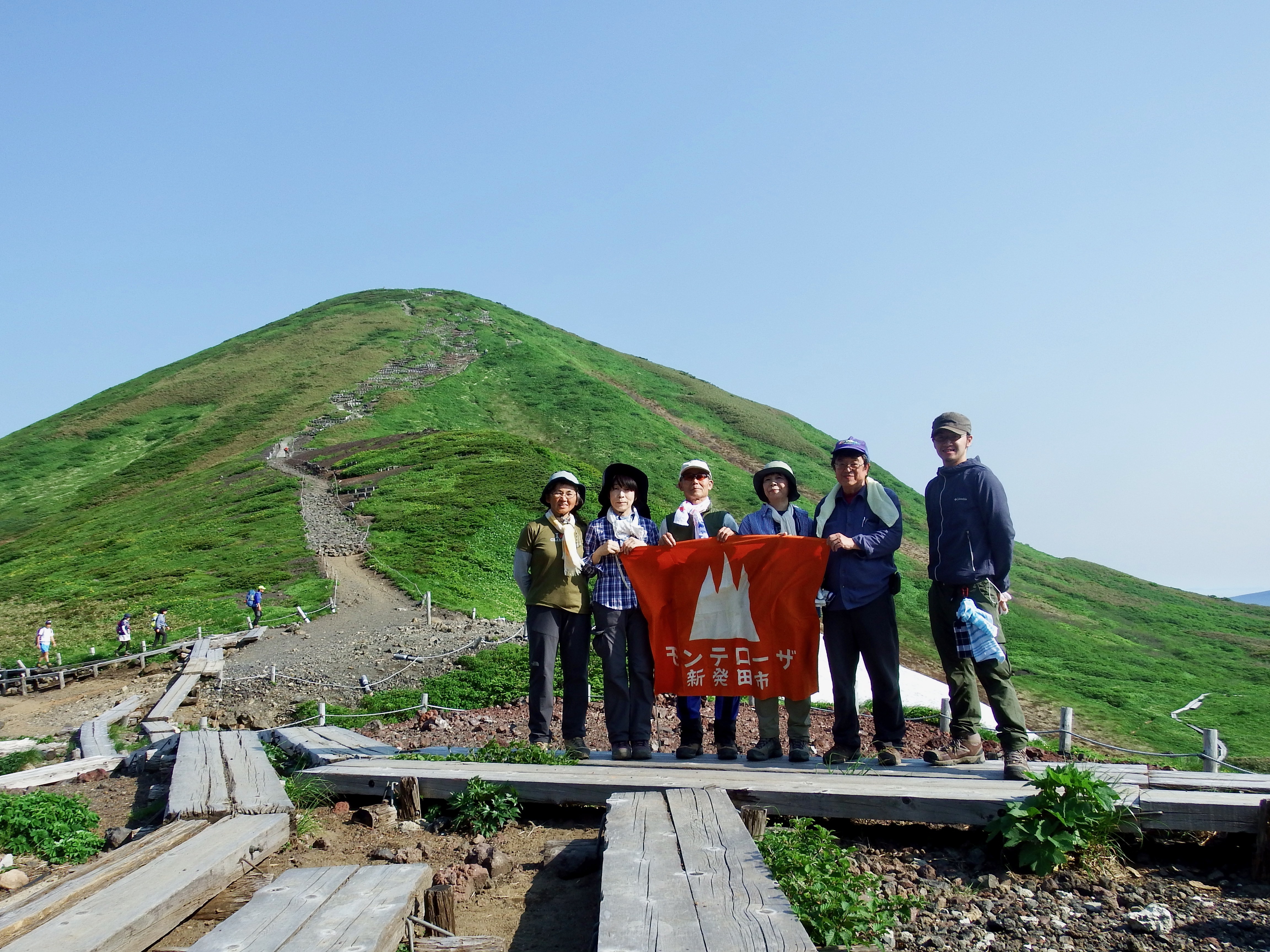 阿部さんを先頭に出発、七合目笹清水を過ぎてから急登が続き、なかなか山頂に届かずでやっとの思いで登頂しました。山頂ではモンテローザの旗を広げ記念撮影、久々にすっきりした晴天で菱から五頭までの稜線歩きは展望が素晴らしく、所々に雪渓が残っていてそれもまた楽しかったです。五頭までの道が長く暑さもありバテ気味になって前一ノ峰に到着、昼食にしました。食事後は元気を取り戻し、三ノ峰からどんぐりの森へ下山、充実した1日を過しました。皆様お疲れ様でした