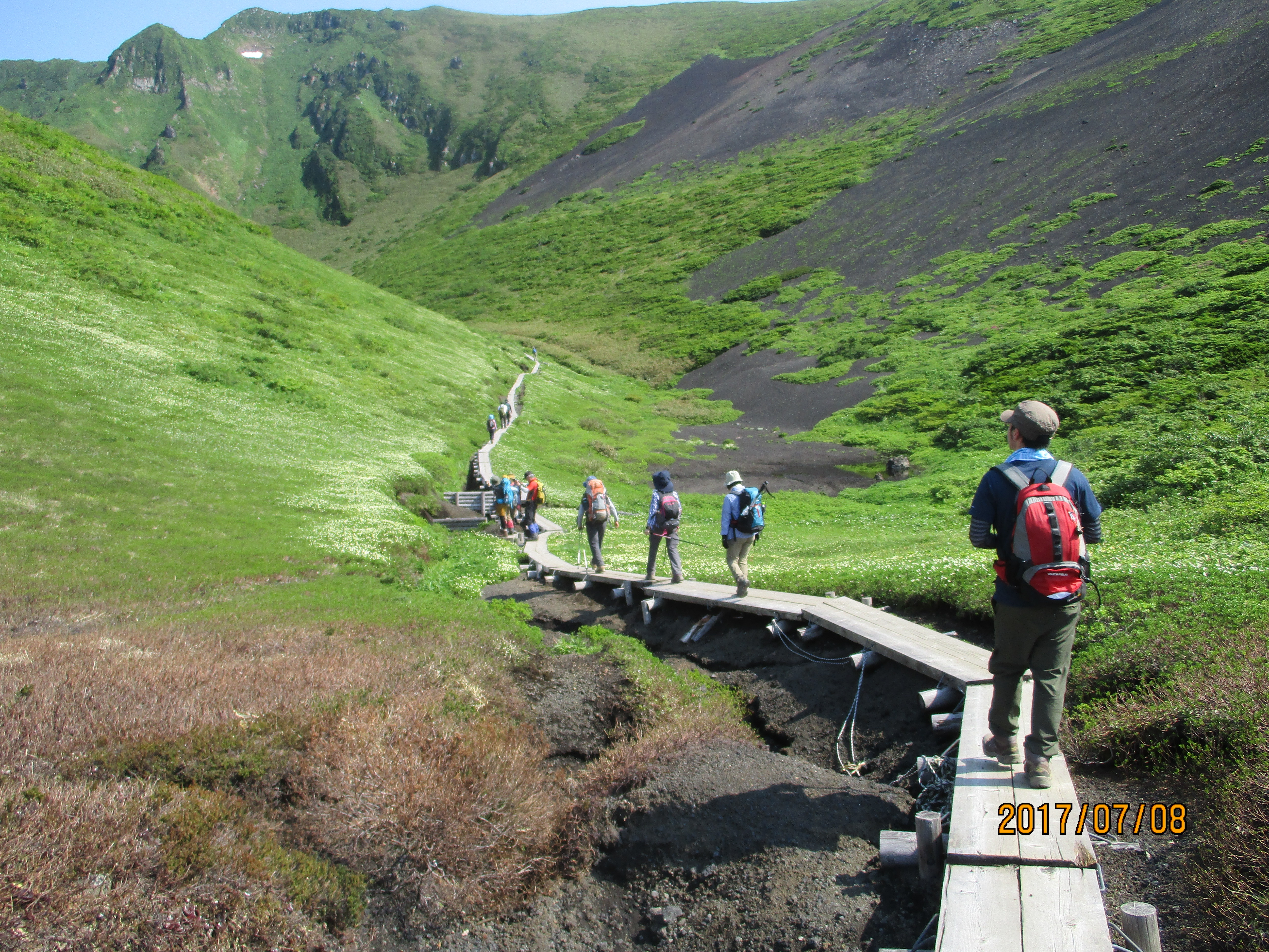 ムーミン谷の木道を歩く小林班が急登を登ってきた。