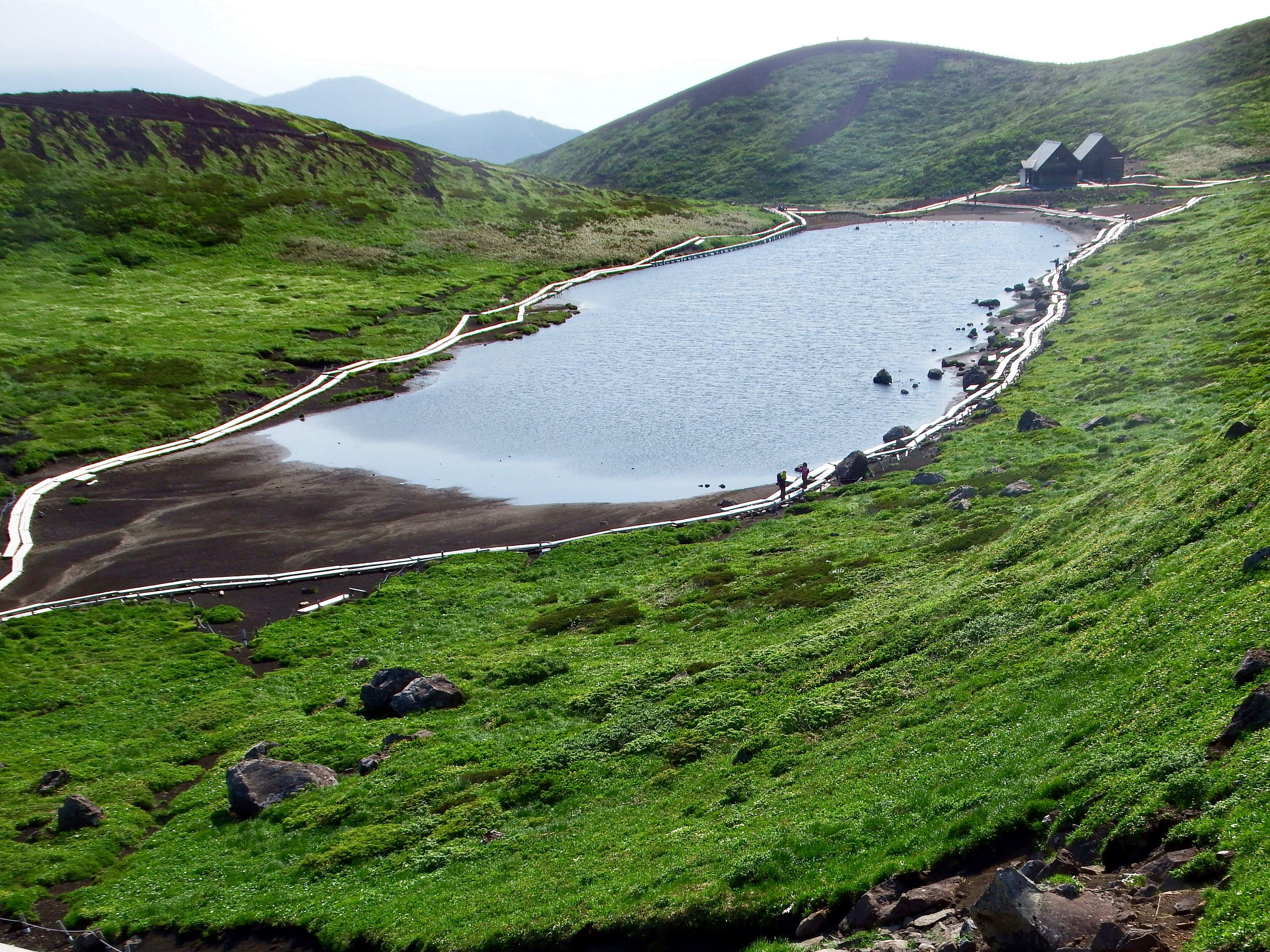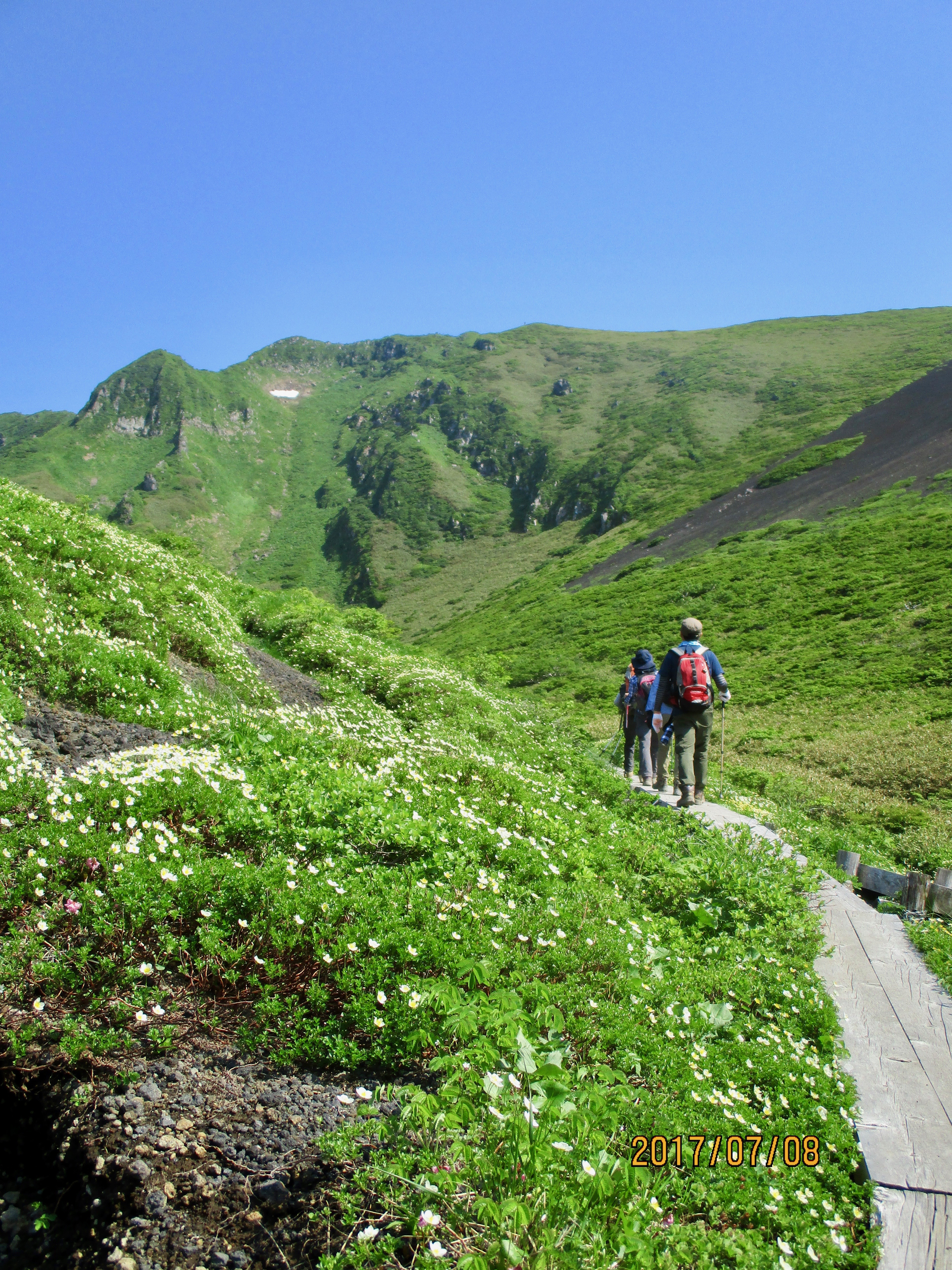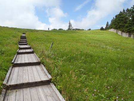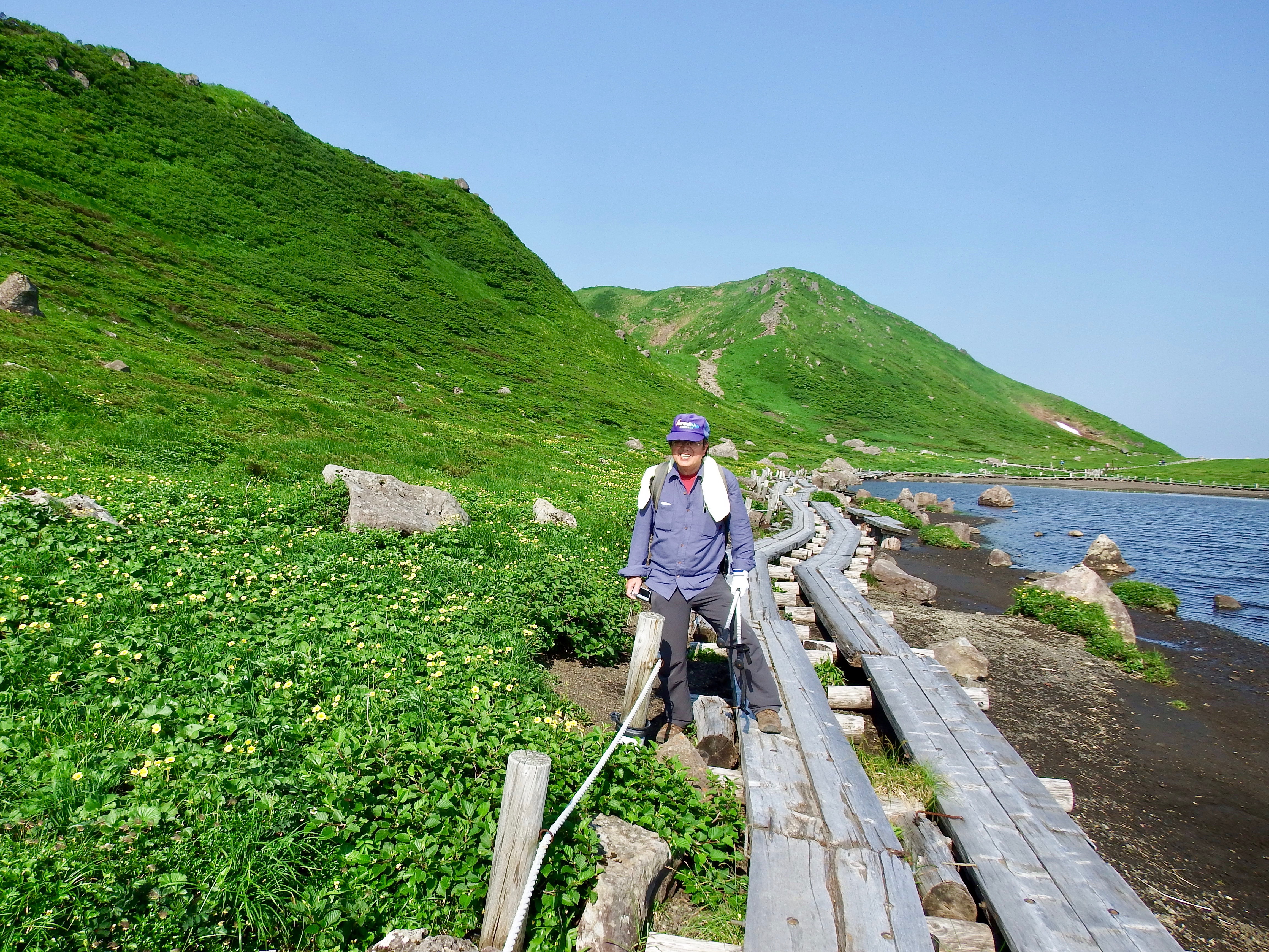 近藤さんと須貝合目は先客の車が多かったが、駐車場にはまだスペースがあった。途中のコンビニで買った朝食を食べて5時に登山を開始する。予定より1時間半以上早いスタートであるが、天候が良く日中は暑く成りそうなので涼しい内に歩くことにした。全コースのリーダーに小林美代子さんを指名して先に出発させる。息子は予定コースを歩きたいと希望したので連れて行ってもらうことに。私と近藤さんは全コースは無理と判断したので 後からゆっくり登ることにした。片倉山展望台までは後について登ったがこの 先は別々の登山となった。花々を見ながらゆっくりと登る。11年前に登った時は膝の痛みも無く、体力もあったので簡単に登れた山も今は他人の体で登っている様だ。阿弥陀池に近づくと木道となって快適であった。