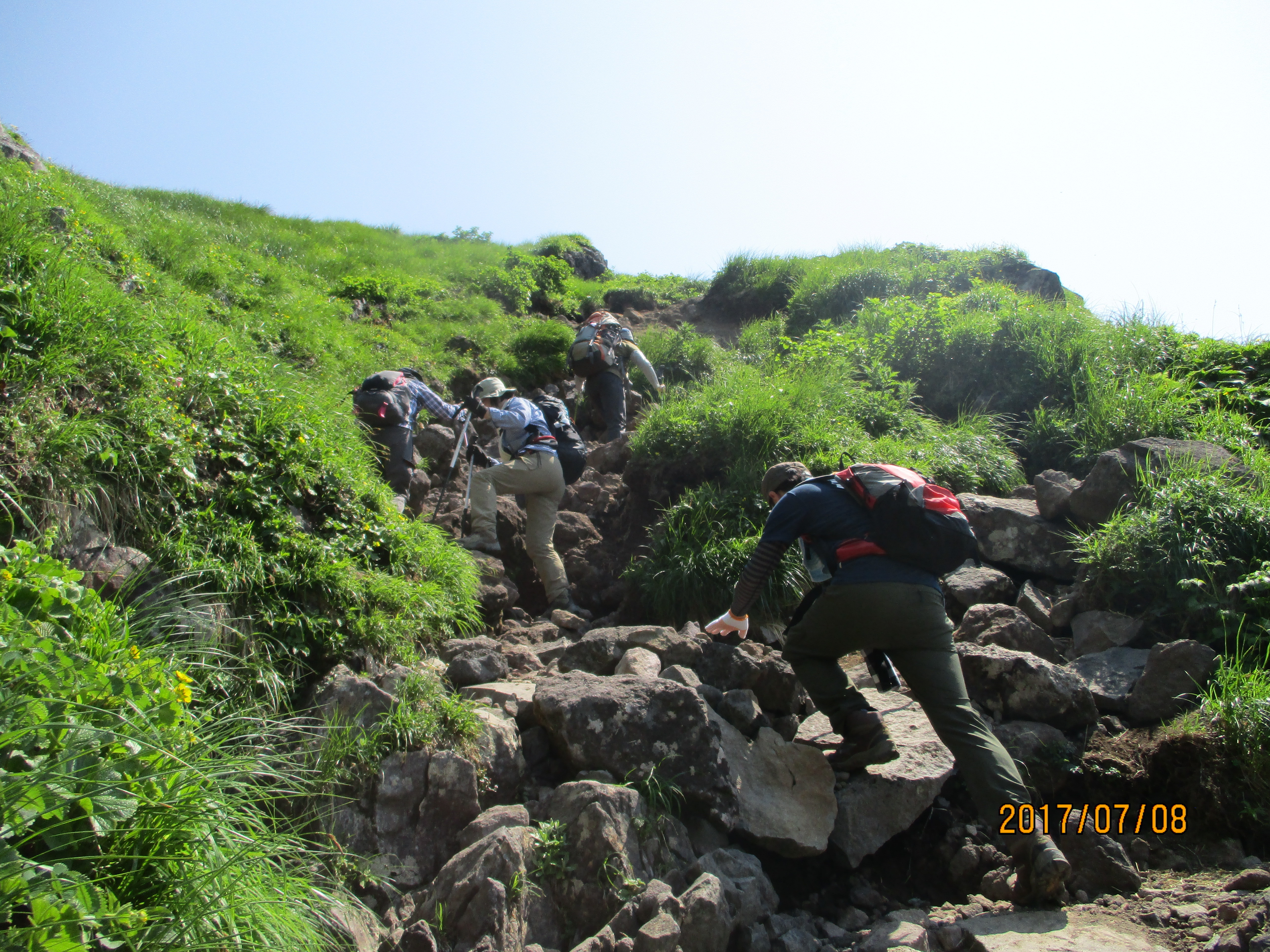 阿弥陀池から男女岳男女岳頂上付近を小林班が登って行く。阿弥陀小屋前のベンチで休憩する。近藤さんが追かける様に登る頃は小林班は山頂であった。私は階段登山道に過去に三国山の下山で膝を痛めたことがあったので断念して見送ることに・・。小林班が山から降りてくる。遅れて近藤さんも降りてきて記念撮影をすると小林班は横岳に向かって出発する。私と近藤さんは、のんびりと池の周りの花を観ながら男岳への鞍部に登る。眼下にムーミン谷からの登山道が急登になっている。その道を登山者が登っている。この道を小林班が登って来るには暫く時間がかかるので私達は昼食をとることにする。昼食といっても午前9時前であったが朝食が早かったので丁度良い時間である。眼下に暑い陽射 しの中を歩く小林班の姿が見えてきた。先頭に小林、山崎、藤田、渓介、池田と続いて歩いていた。私に変わって登ってくる息子に時の流れと青春時代の思い出が重なって感無量であった。 若い頃は歩く登山が当り前であったが、今はのんびりと自然の空間で風を感じたり、日射しの下で草花に心を馳せるのが好きである。山や友が感動と温かい心を与えての私の青春であり、人生だったのだ・・。