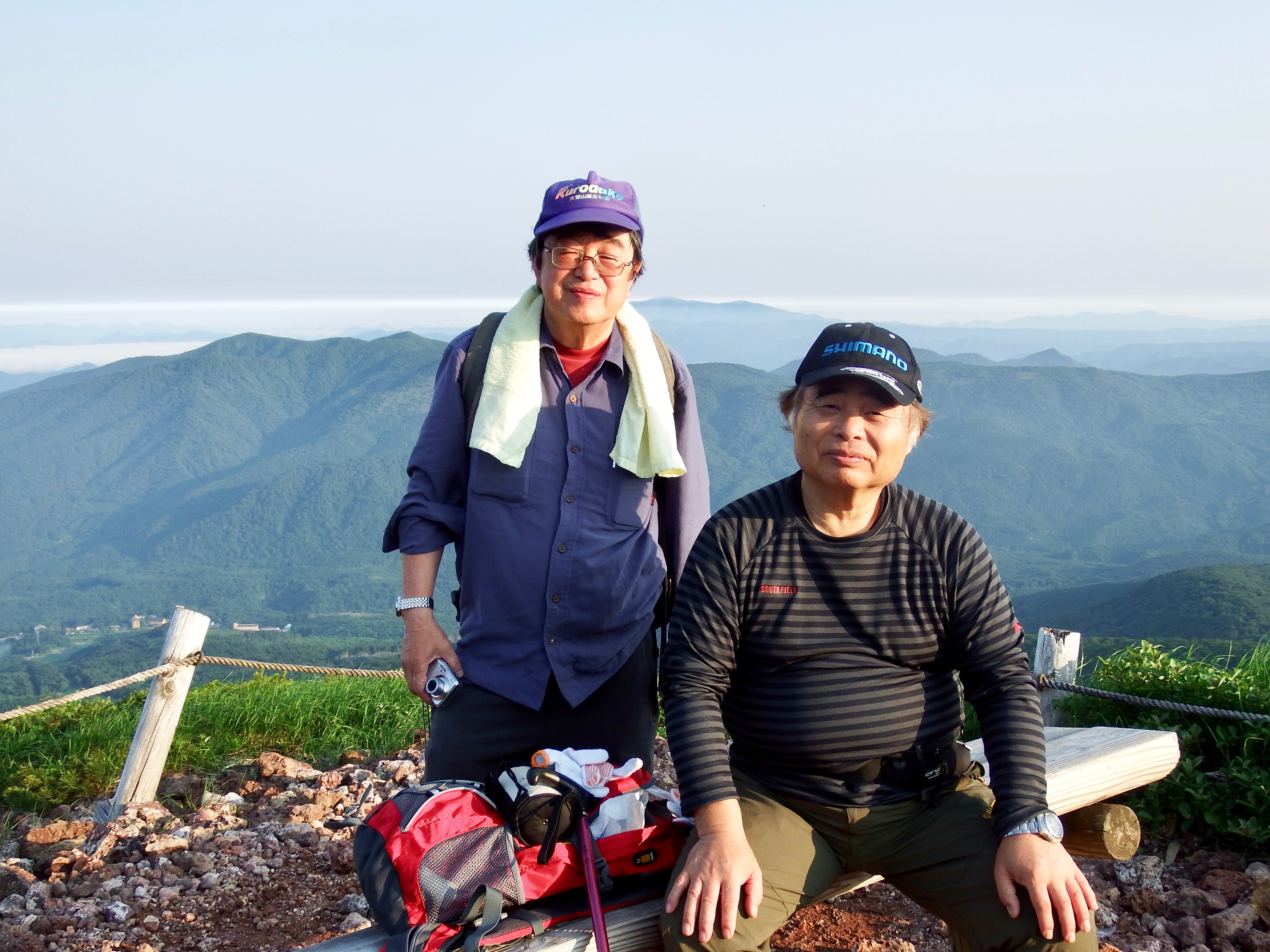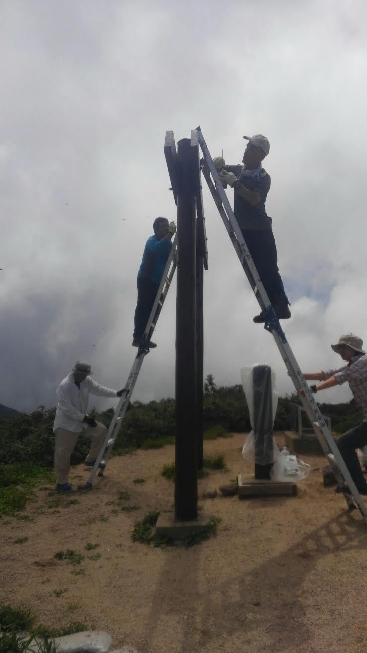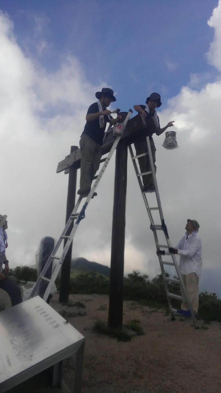 人との出会いと、青春の鐘子岳登山口を朝5時30分に登り始める。夏の登りはゆっくり歩き、休息時間を短くして山頂を目指すことに心がけた。お花畑で水を補給し、ペットボトルを山頂へ持って登る。今年の参加者は3人で遅れて健さんが合流して4人なので、どうしてもペンキを塗るために人手不足であった。山頂に着くと水場で出会った青年二人に協力をお願いしたところ、快く承諾し手伝ってもらうことになった。脚立2台に登ってもらいペンキ塗りが始まった。ペンキの量が足らずギリギリの様だ。ツヨミさんに現場監督をお願いして全体を見てもらい、小林さんと私が脚立を押えながらペンキを補給する。山頂
