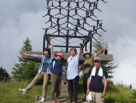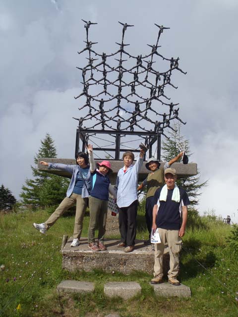 王ケ頭山頂王ヶ塔に着いて、全員で昼食、ドラエモンのポケットみたいに良く入れてきたなと思うくらい、いくらでも出てくる食材で満腹になり山談義で楽しいひと時でした。帰りに美術館に行きましたが屋外の美術品で、作品のタイトルの意味が良くわからないものが多く、いかに芸術的センスの無さにがっかり。それでも、ここに来ないと見学できないものであり意味不明ながらも、みんな満足のようでした。今回参加された皆さんおかげで楽しいひと時でした。参加された皆さんお疲れ様でした。そしてありがとうございました。