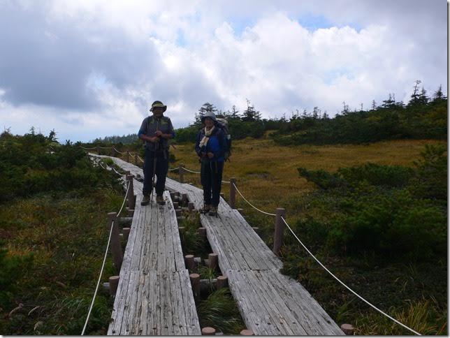 なだらかな斜面を登り、色着いた木々や景色を堪能しながら、芝草平までやってきました。広い湿原で草紅葉の湿原に池塘が所々にあり、木道が敷かれていてとても気持ちの良い場所でした。他の参加しなかった会員にも、機会があったら来てみたい場所です。ここから一登りで屏風岳の山頂に到着。