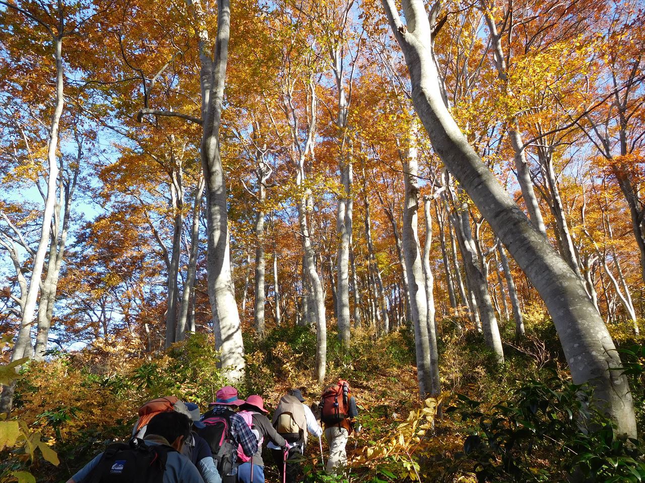下山後の胎内ヒュッテ付近は、紅葉を楽しむ観光客で賑わい、車も駐車場に入れず渋滞していた。靴を履き替えていると誰かが「この付近のブナの幹は色が黒っぽいが、山の中は色白できれいだったね。」と。確かにそのとおりで、観光客のみなさんにも色白のブナを見せてやりたいと思った。