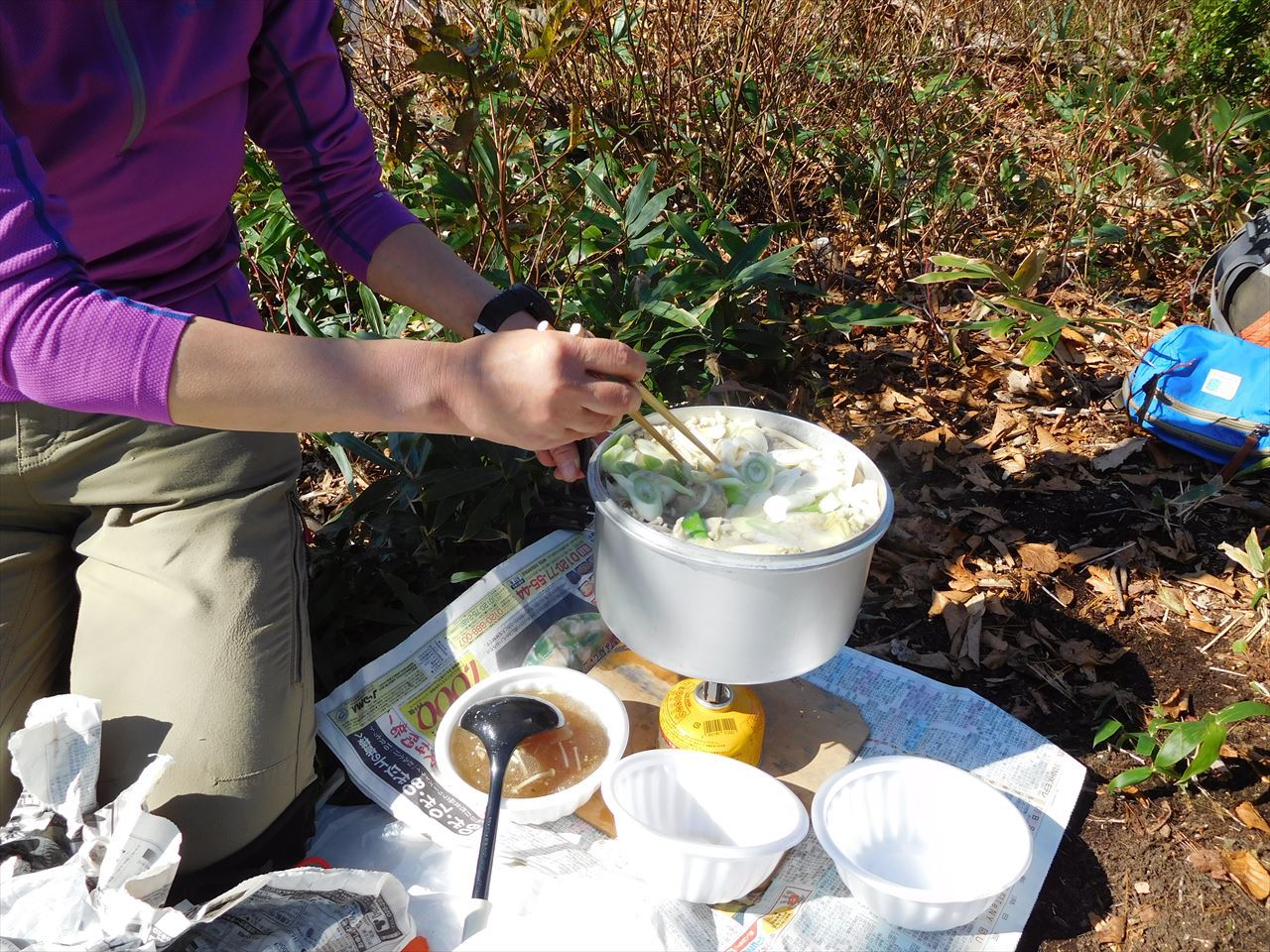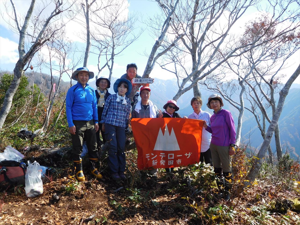 晩秋の鍋倉山 山頂にてその左奥に杁差岳小屋もはっきり見える。右側に目を移すと北俣や門内も見える。後ろには二王子岳。そして、ツヨミさんが用意してくれた鍋料理やみなさんから頂いたさまざまなものを食べながら、まもなく訪れる冬を前にした短い秋を満喫した。