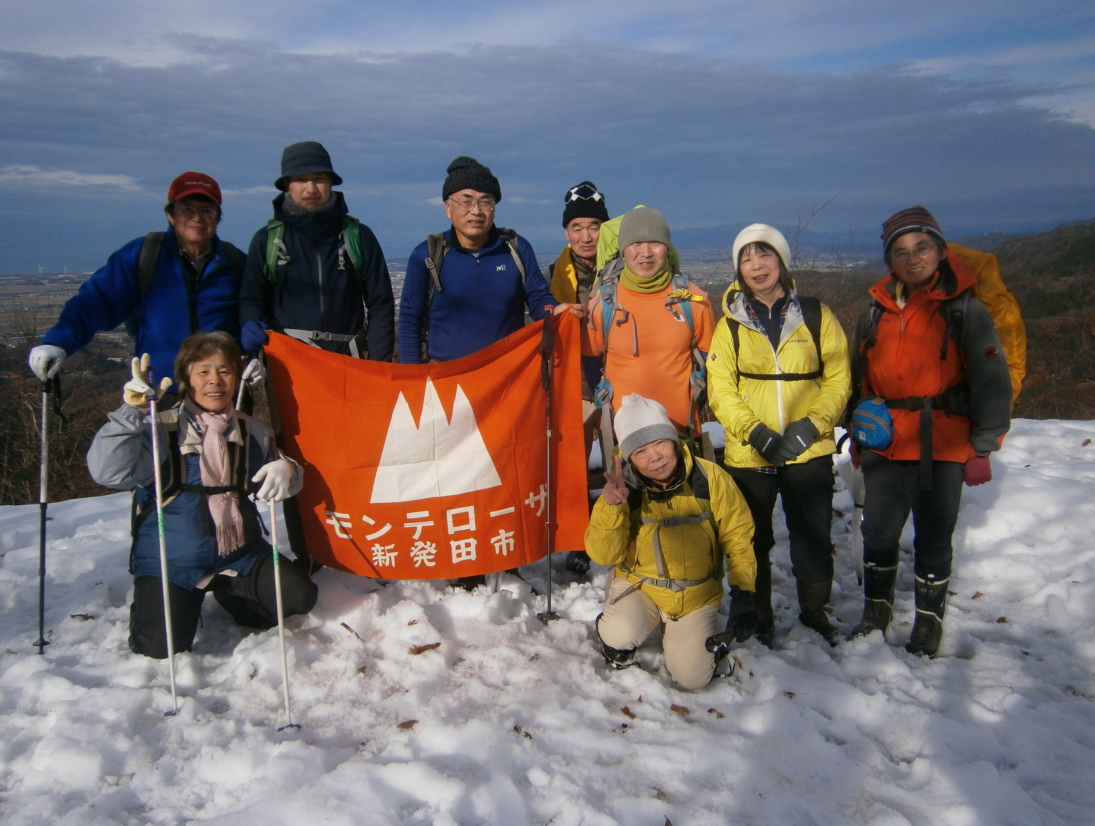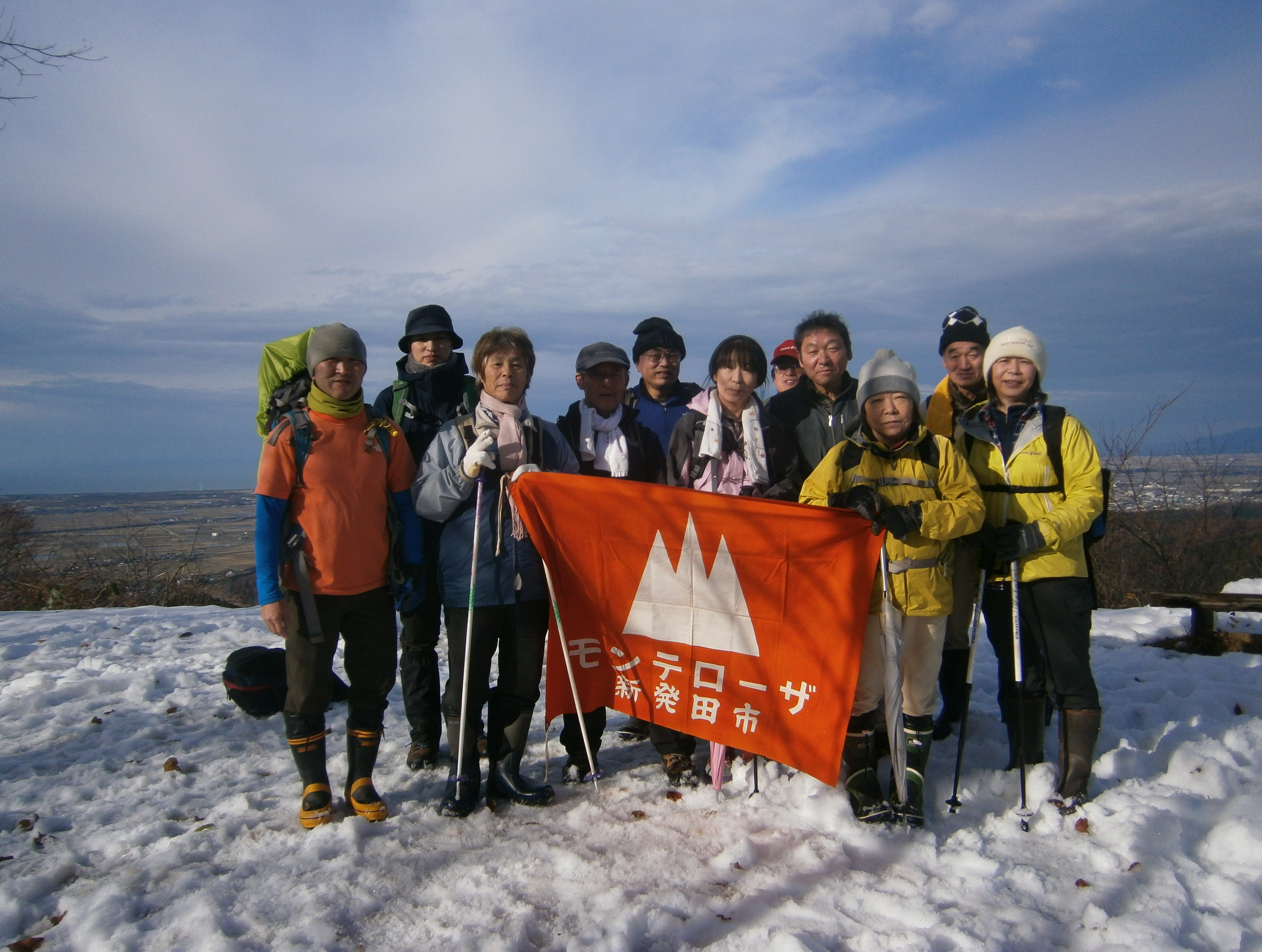 毎年、例年だと4~5人程度の参加でしたが、今回は新しく入会した藤井さんの参加もあって12人の参加でした。いつものように山田さんを中心とした話題豊富な賑やかな話声のモンテ登山隊。終始メンバー全員の笑顔印象的でした。これでは、冬眠の熊もびっくりして飛び起きてくるかと心配しましたが、それはありませんでした。最初、桜公園から出発、時期外れの山桜が咲いていました。ここで記念撮影。新雪もそんなになく、少し滑りやすい登山道を行く。途中で、高橋さんがキノコがあるかも・・という事で見に行ってきてぅれたが、残念!!他の人もキョロキョロしながら歩くが少し時期が遅いのか、見つけられないのか昼食に入れるような食材はありませんでした。ワイワイガヤガヤ賑やかに行くといつの間にか願文山到着。