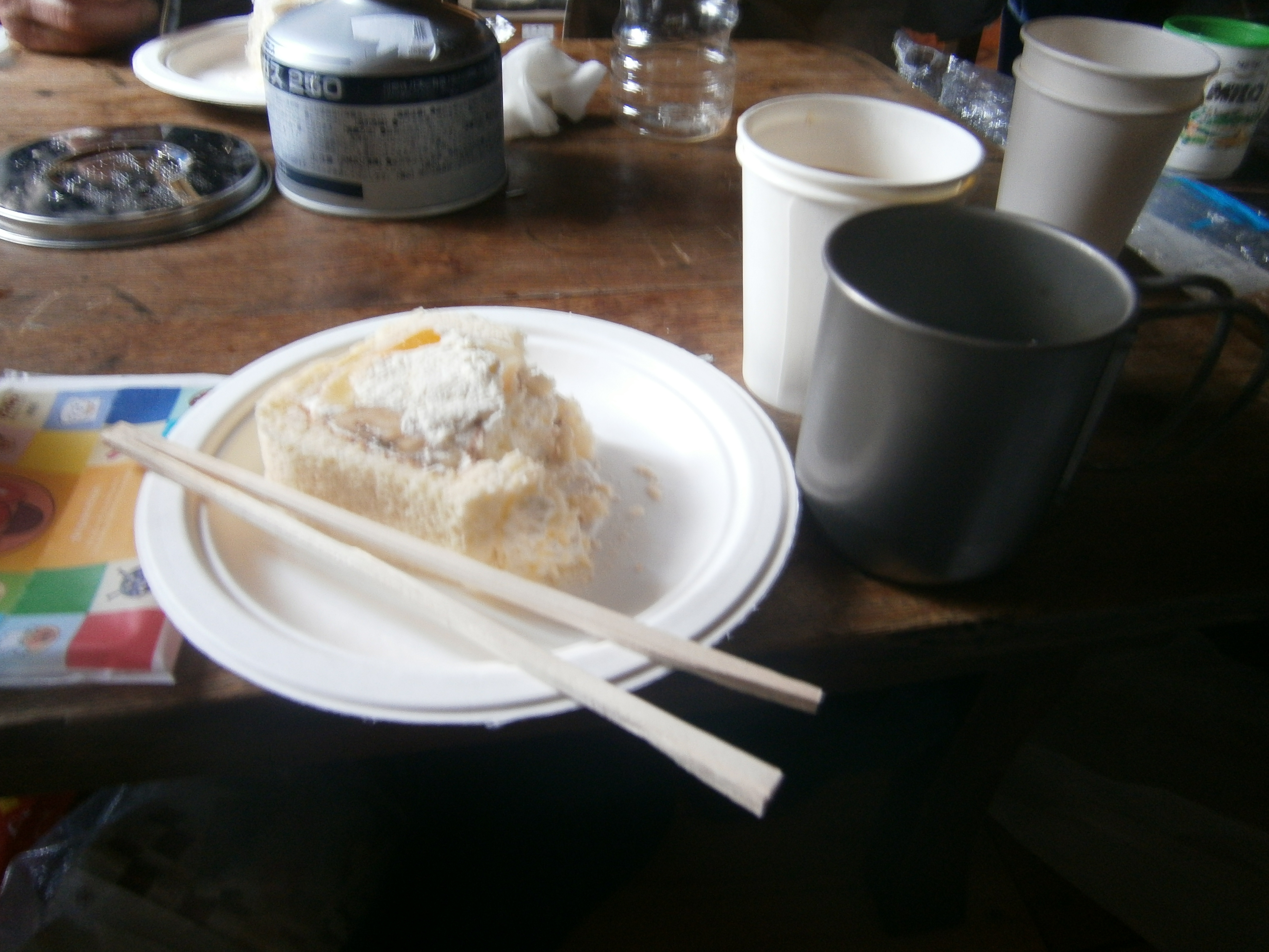 ここからもう一登りで大峰の小屋。登山口の駐車場には数台の車しか駐車していなかったので、今日の小屋はすいているな?・・・と思いきや下の階では大勢の人が昼食中、座る場所が無い。モンテ登山隊は上の階でクリスマス会をすることにした。早速、テーブルを出して鍋物作り、ロールケーキとノンアルコールで乾杯。山談義や山田さんの勉強になる話を聞きながら食事をする。次から次へと出てくるおつまみ、食べ物。お腹一杯食べ至福のひと時を過ごすことができました。天気も曇りでしたがそんなに悪くなく登山日和で楽しいひと時でした。今回参加されたみなさん大変お世話になりました。ありがとうございました。