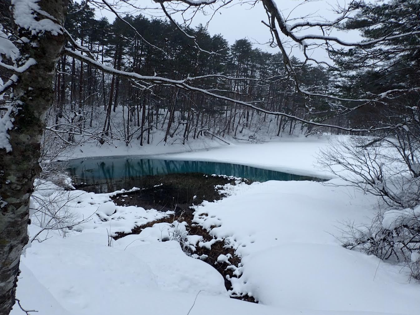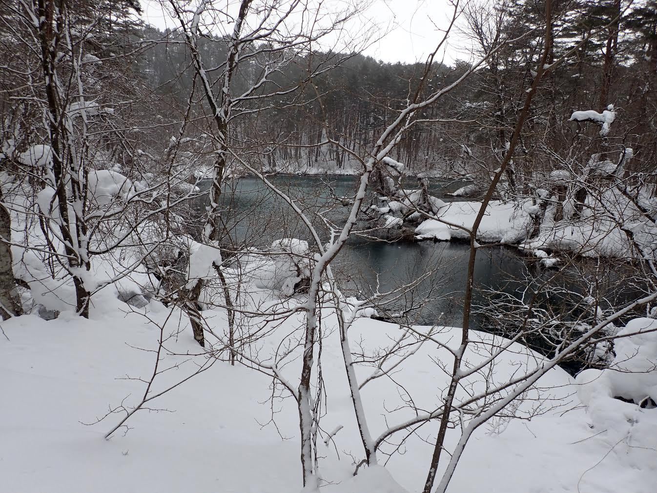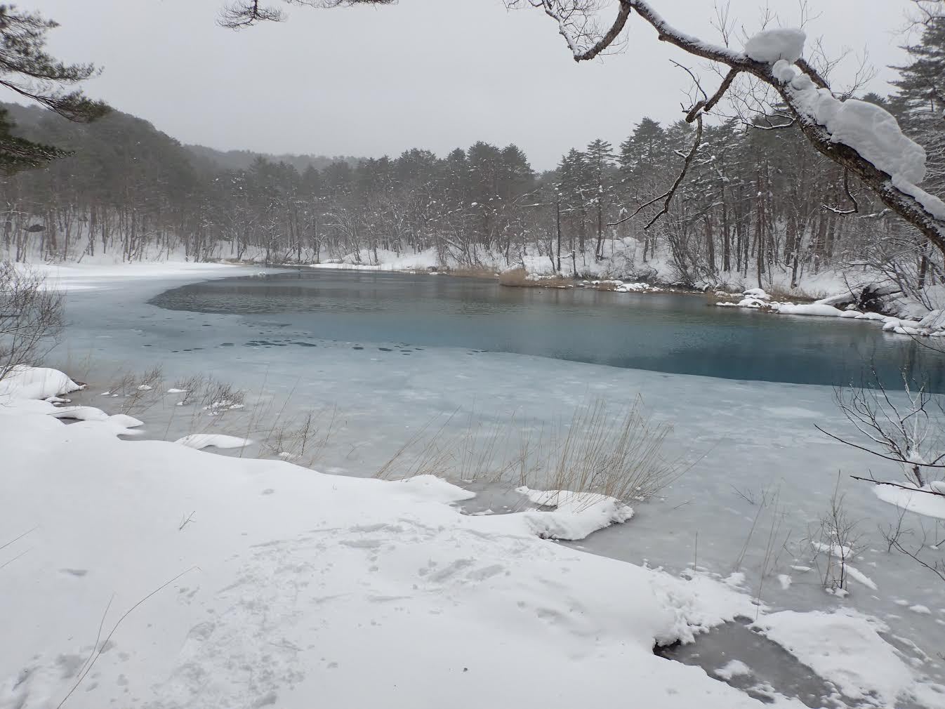 幸い大勢人が入るので踏み跡がしっかりついていたが、最初はたくさんのトレースがあちこちにあり、しばらく登山口で右往左往したが、それでも最後には道に乗ることができた。途中、沼が沢山出てきたが、どれも湖水の色が美しく一つ一つどれをとっても冬期ならではの景色で感動的でした。1時間30分の予定を休憩や食事をとりながらゆっくり歩いて反対側の物産館に到着したのが2時間位でした。ここで、タクシーを呼びました。屋根のある物産館でタクシーが来るのを待っていると、先着の飼い主さんと2匹の犬がいました。とても、眼がやさしそうな犬で静かに寄ってきて一緒に遊んだりしました。とても気持ちが癒されました。少し運転の荒いタクシーに乗り、ビジターセンターに向かいました。車に乗ってほっとした所で、安達太良の登山口にある沼尻温泉に寄り、帰りは定番・喜多方ラーメンを食べて帰宅しました。今回参加してくださった方に感謝!感謝!・・・軽い雪上ハイキングとても楽しかったです。