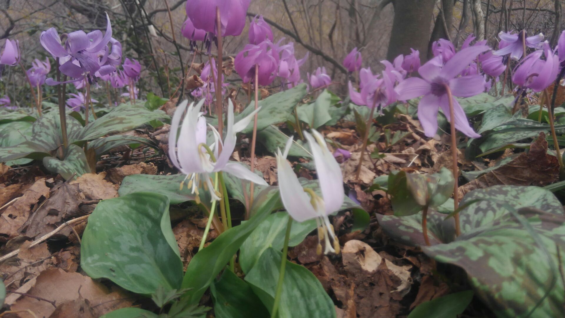 9時10分登山口、登り始めから色とりどりの雪割草が満開。登山道も満員で列が途切れません。花の撮影も順番待ちです。今年は花が早いようで、カタクリも満開。見渡す斜面や登山道が全てカタクリの絨毯でした。中でも白いカタクリはスーパーアイドル、必ず人が集まっていて撮影会です。