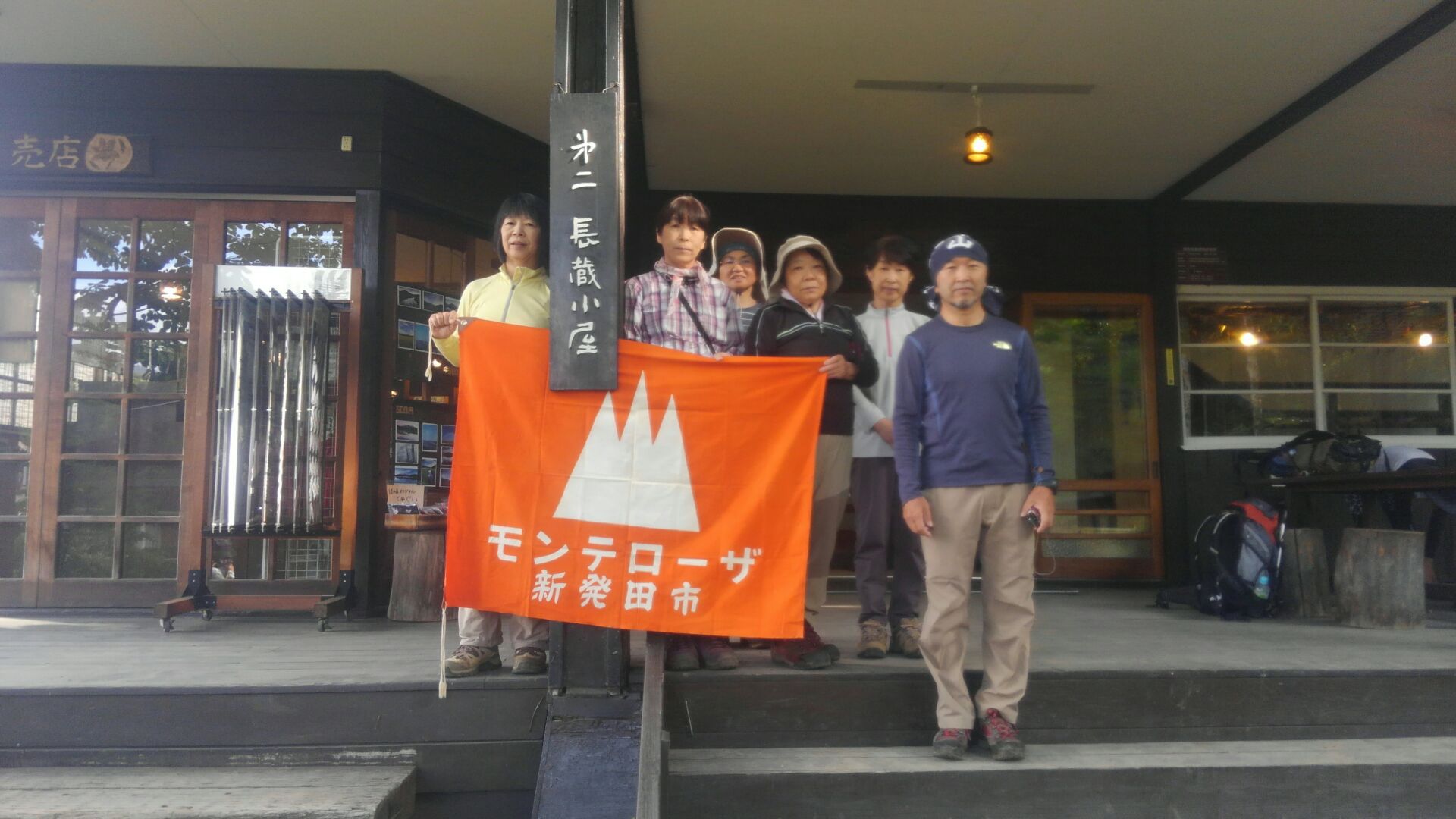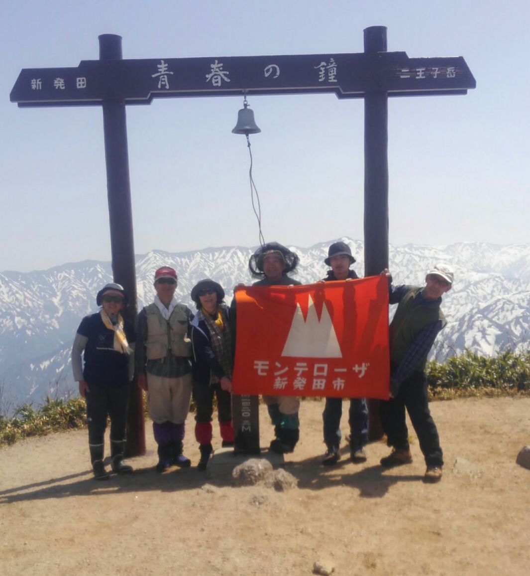 10時40分山頂、モンテの旗を持ち記念写真。広い山頂も大にぎわいなので、観音堂まで異動してお昼。越後平野を眺めながら気持ちのよい時間を過ごしました。