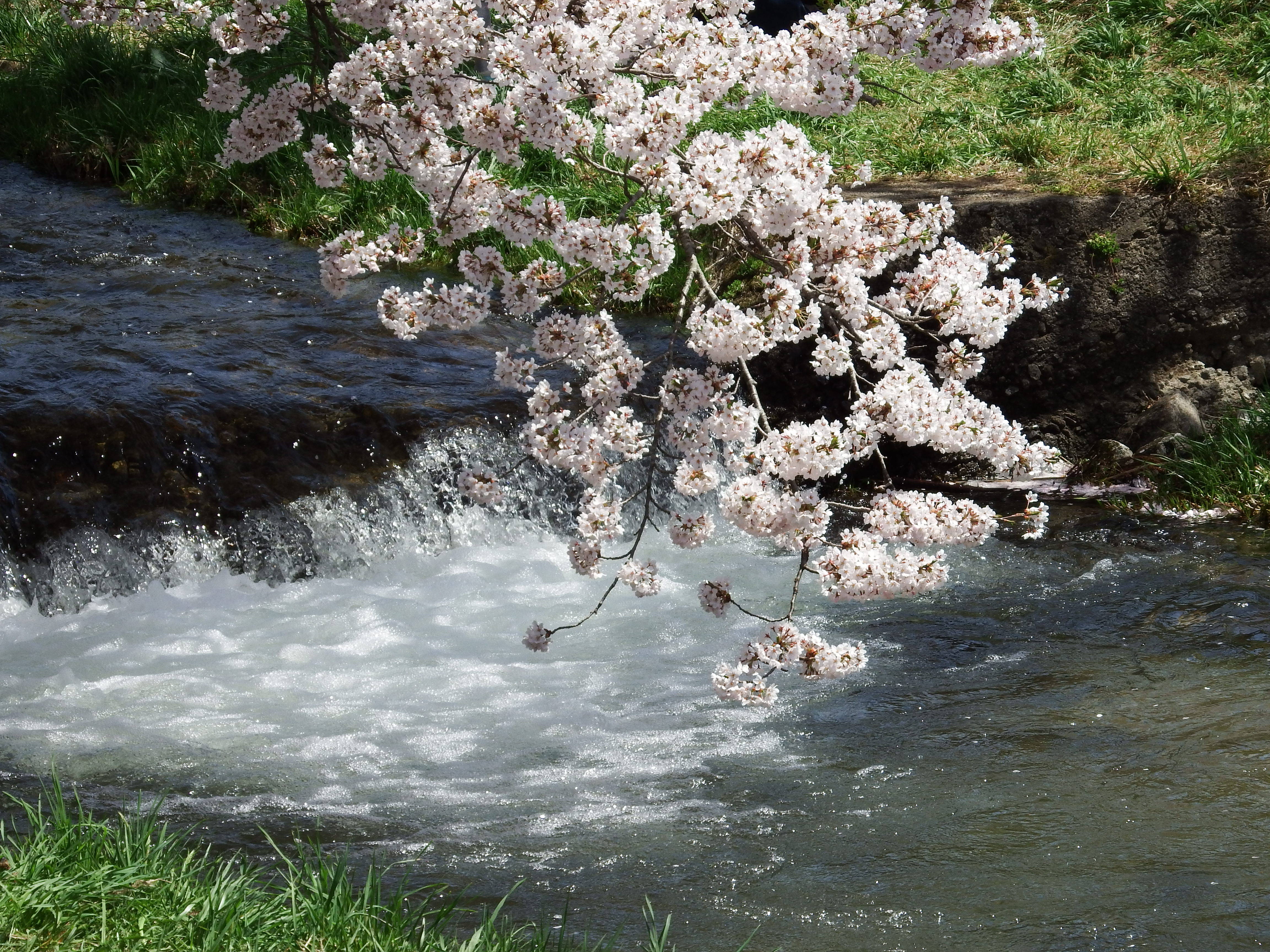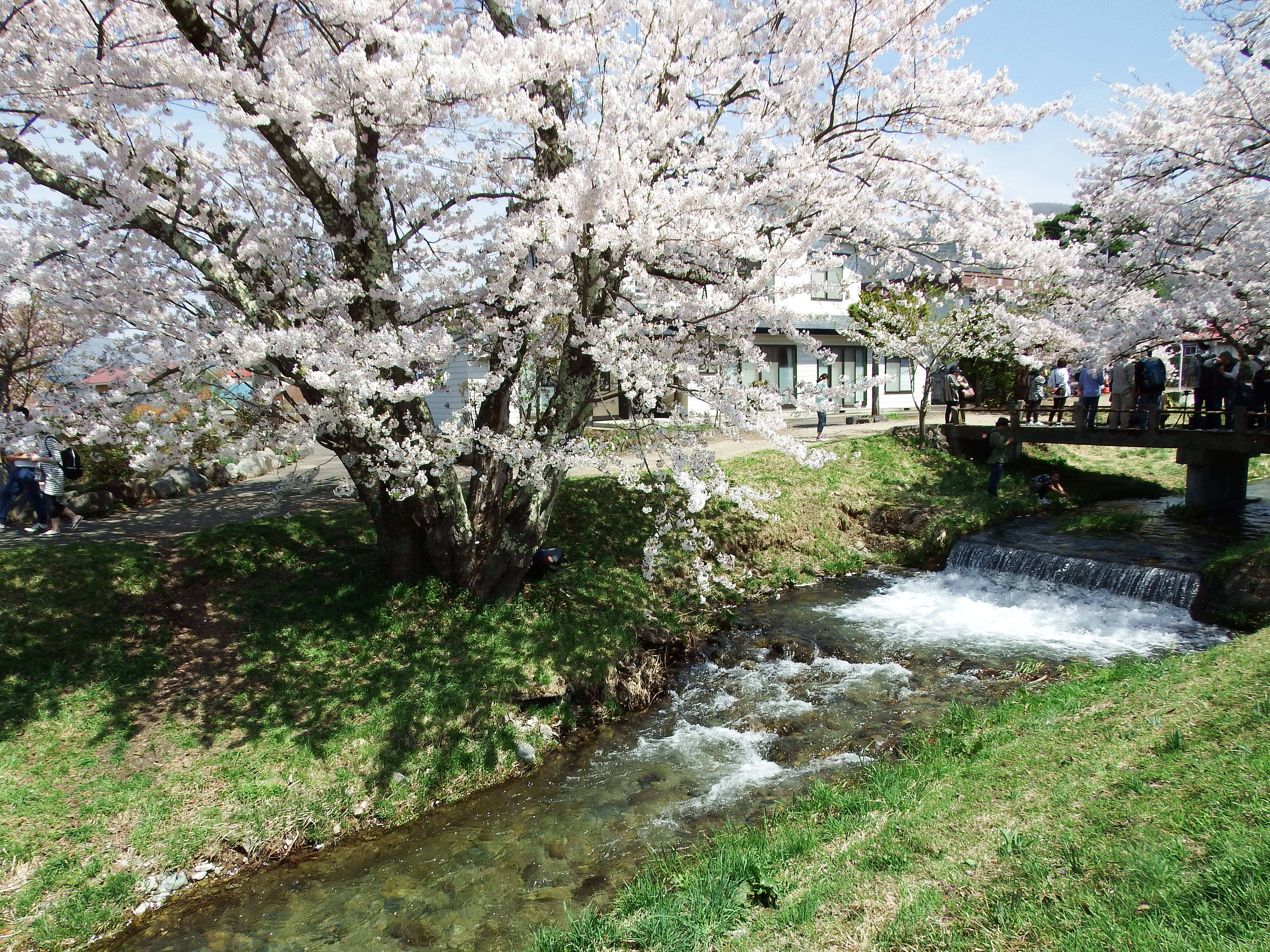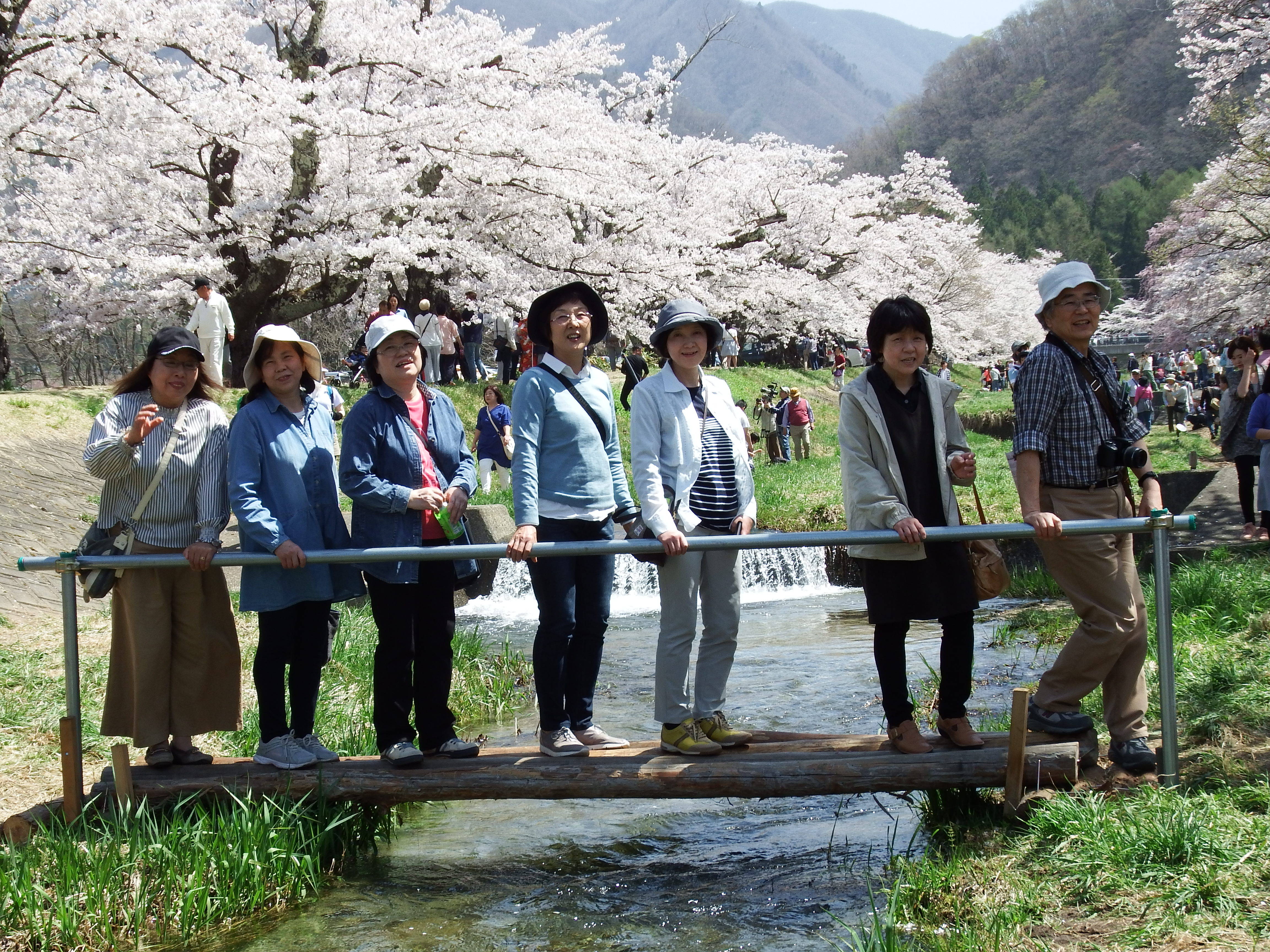 ワイワイお喋りして車を走らせると会津はアッと言う間に着いてしまった。インターを下りて約束の駐車場へ行くと高野夫妻がニコニコと出迎えてくれた。運転を高野氏に代わり、彼任せのドライブの始まりとなった。運転手とガイドの両方を受持ち、皆んなを笑わしてくれる高野氏のテンションは高い。最初に案内してくれた場所は猪苗代湖の近くの観音寺であった。智子さんが桜の情報収拾をしてくれたらしく、満開の桜で迎えられた。ここは、両側の桜並木の間に小川が流れ、花びらが水面に舞い落ちて気持ちの良い空間であった。何処かの新婚さんが和装や洋装で記念写真を撮ったりと、大勢の花見客で賑わっていた。我がOGメンバーも負けずと記念撮影・・