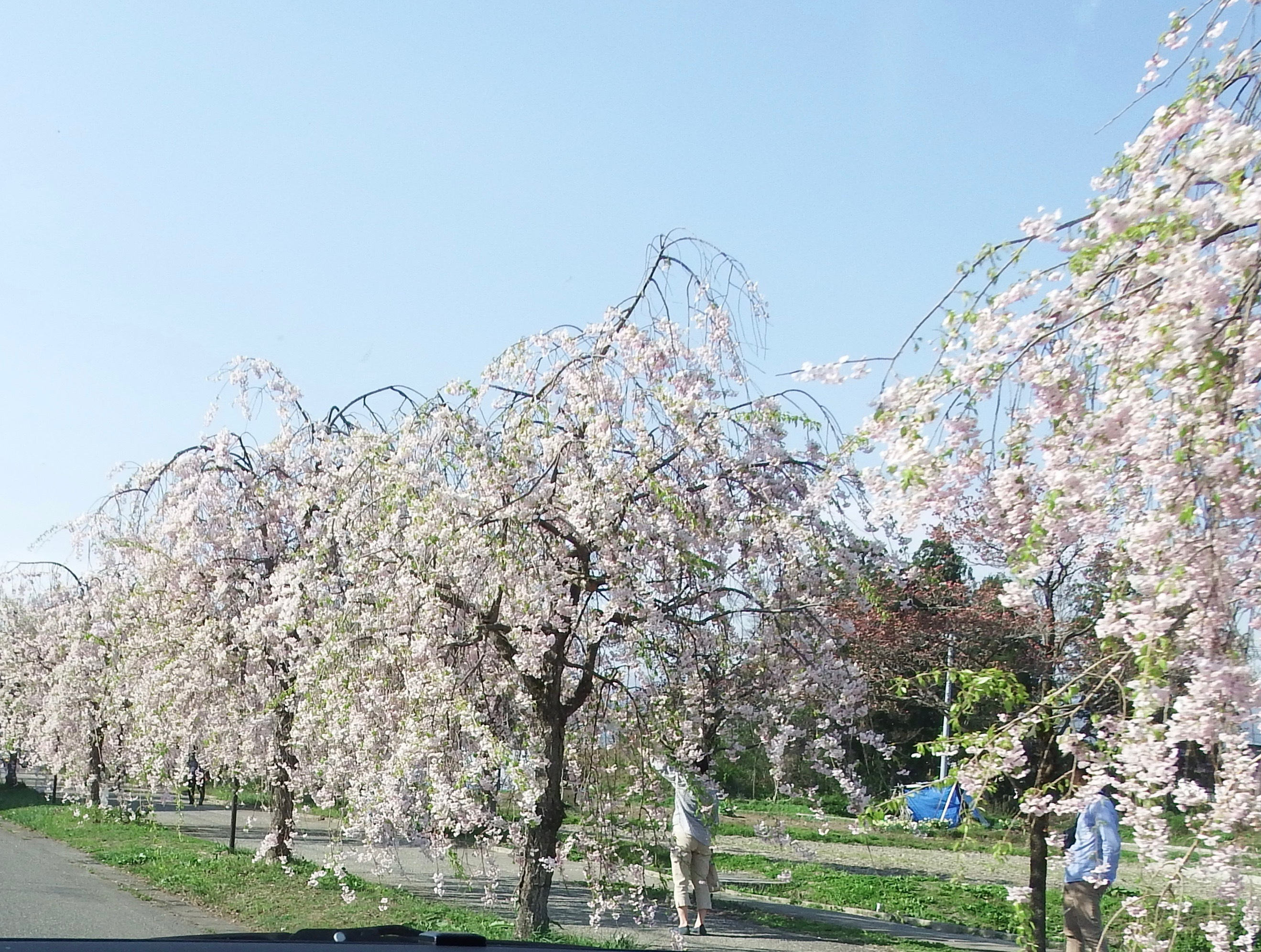 そこから道の駅に寄ってソフトを食べたり、桜峠で山一面に咲く山桜を見て喜多方へ。高野氏の家の近くに咲く枝垂桜、最近人気の場所だ。見物人も多くいて、枝垂れの美しさを見ながら歩いて見学し出したのだが、なんせ年寄り集団、すぐ疲れて歩く気力喪失、車の中からの見学となった。並木の樹齢は20年くらいとまだ若いが、今後益々人気で集客が増える事だろう。帰りにお土産を買いに道の駅に立ち寄る。高野氏から「会員さんが焼いたパンなので皆んなで食べてみて」とパンを沢山戴く。