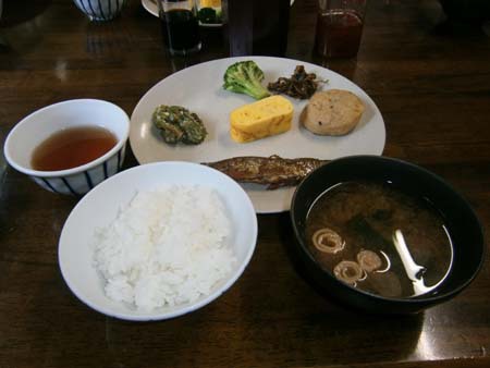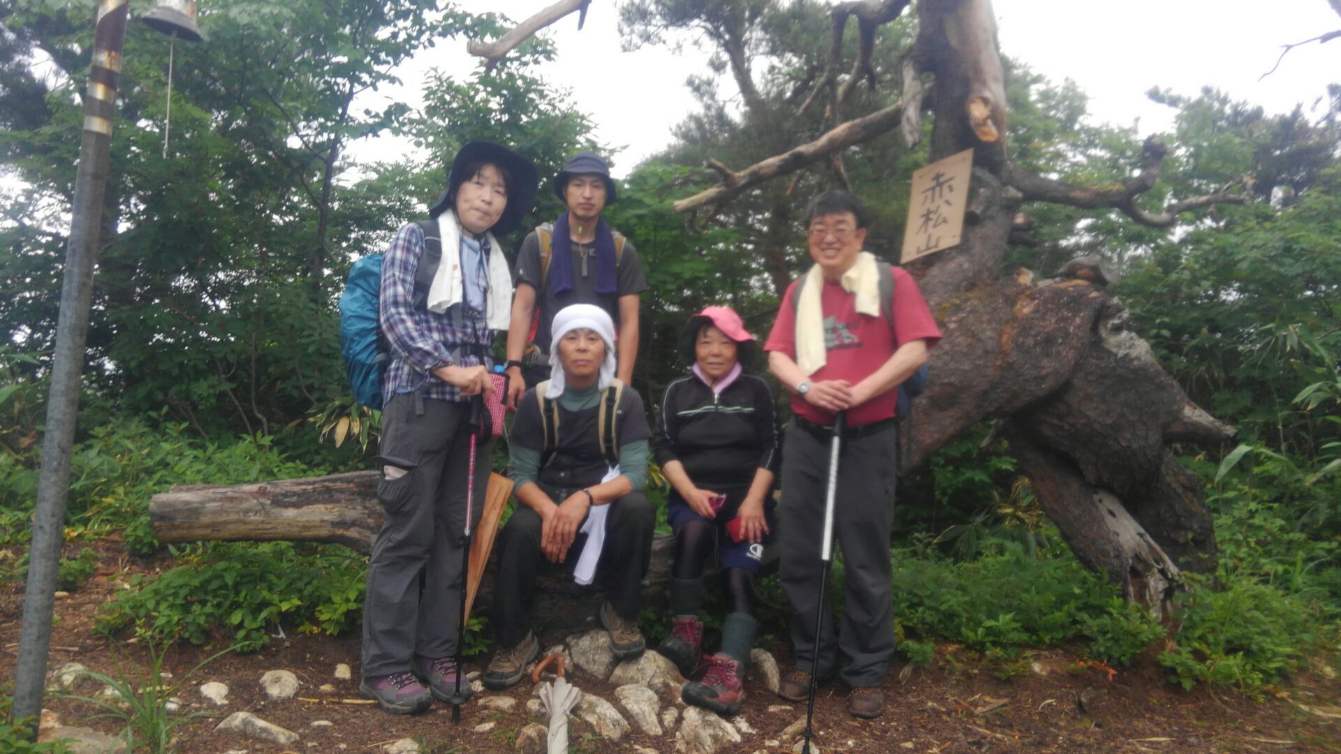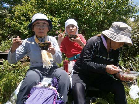 昼食は女性達各々が持寄った御馳走をいただき、至福のひと時だったが、雨が心配だったので早々に切り上げて下山にかかる。11時25分下山開始。登山道は粘土質で雨のせいで滑りやすくなっていて、ロープの有るところはロープをつかみ慎重に下る。12時30分赤松山通過、13時20分登山口到着。車で宝珠温泉に行き汗を流し、帰路に着く。15時 五十公野公園駐車場着、解散。