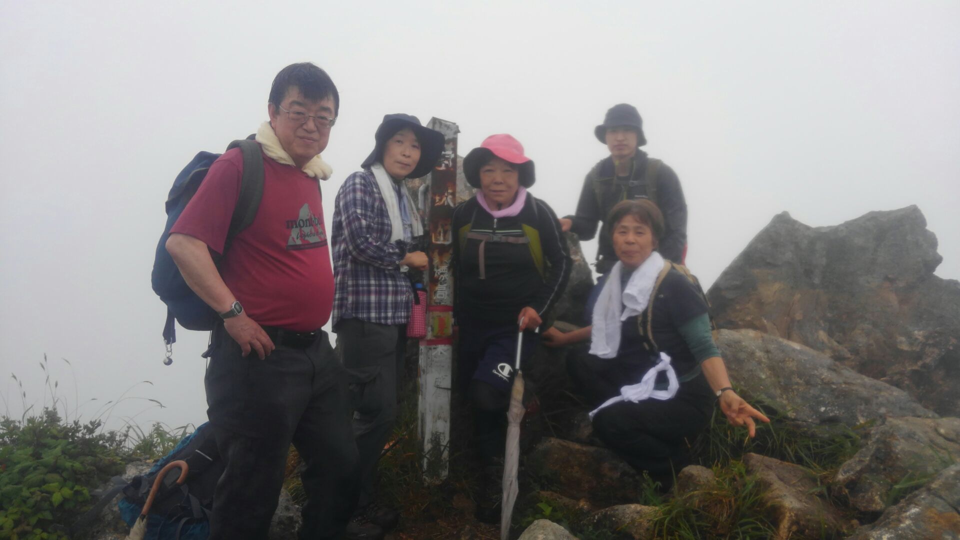 八咫柄山分岐を過ぎて登って行く。最後の登りにかかる、10時45分頂上に到着。この頃になると雨が止む。頂上には誰もいなかったが、まもなく熟年の団体が到着がする。雨がやんでいる間に頂上で昼食にする。団体は少し下のスペースに休憩していた。以後2・3人が来たが、角田山等に比れば静かな山だ。