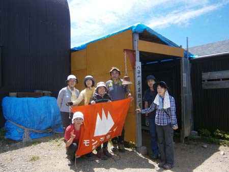 頂上に10時20分着、飯豊の稜線がきれいに見える。藤井さんと私で鐘上げの準備をし、池田さんが鐘を吊す。鐘の音がカーンカーンと飯豊の山々に響いてゆく。今年はどのくらいの登山者がこの鐘を鳴らすことだろう。小屋の外で昼御飯を食べて11時40分に下山とする。
