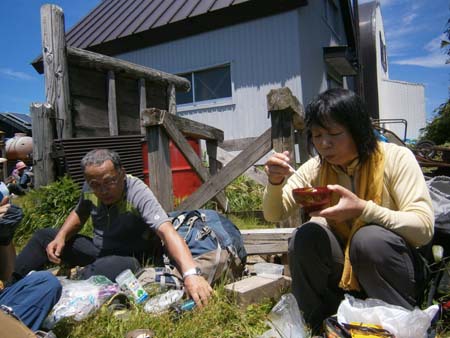 当日は、快晴で朝から少し暑い位で、5時半に聖篭新発田IC集合、出発。小林(ひ)の腰痛はかなり長引いていて、右足が少し痛い。重いものを藤井さんに持ってもらうことにした(ありがとうございました)。今回は千本檜小屋までの途中に少し、長い岩場を越えるので、簡単な岩登りとロープワークの練習を兼ねてカラビナ数枚、8mmザイル、スリングを持参しました。ロープウェイ降り場で、簡単な準備体操をして出発。当日暑い位の陽気で、途中、花や景色を眺めながら登山道を行く。写真撮影に余念がない山崎さん。時々小休憩を入れながら、ゆっくりのぼる。女人堂まで来て、大休憩。軽くおやつタイム。