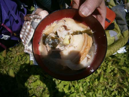 他の登山者も何人か休んでいた。ここから先は、千本檜小屋手前で岩場があるので、ロープをいつでも出せるようにした。貴重な水場を過ぎて、手を軽く濡らすととても冷たくて気持ちいい。少し行くと、岩場が出てきたのでロープ確保の希望者がいたので伊丹さんと滝沢さんを確保。丁度良い岩登りの訓練にもなった。やっとさ千本檜小屋に到着した頃には昼食の事で気持ちが一杯になり、八峰の岩場への希望者なく、途中まで行って引き返しました。当日は、山開きで大勢の人で小屋付近は混雑していて、思いがけない地元山岳会の方の手作りトン汁が一人づつに配られ、地元の方の温かいもてなしに感銘しました。下山後、五十沢温泉で入浴、全員無事に帰宅の途につきました。今回参加された皆さんと楽しく山に行けてとても思い出深い山行でした。ありがとうございました。(小林 ひ)