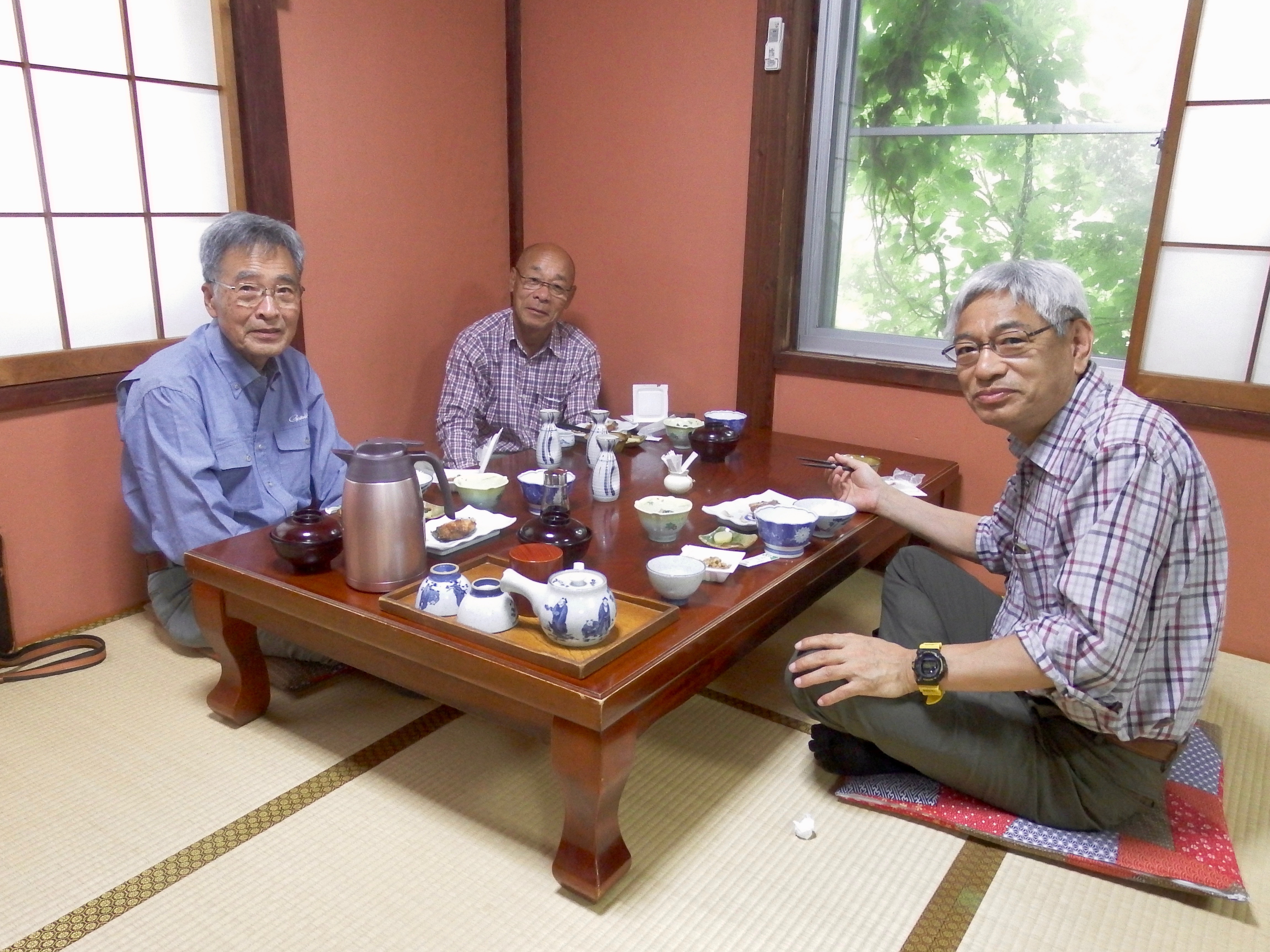 朝食時のAさん達大石川や荒川も追うように増水して釣りが難しくなって、午後には釣り人が殆ど居なくなった。これも、致しかたない。釣りも天候次第とDさんは川には行かずに親父の水槽掃除を手伝ってくれた。その後は一升瓶を恋人に親父との人生談義に時間を潰した。一番最後に宿に戻ったAさん達は府屋大川まで行ってきたらしい。午後2時頃から竿を出して順調に釣れていたが20分もすると雷がなり、釣りは無理となった様だ。近くに居た釣り人は朝から竿を出して居たので相当釣っていた様だと話す。