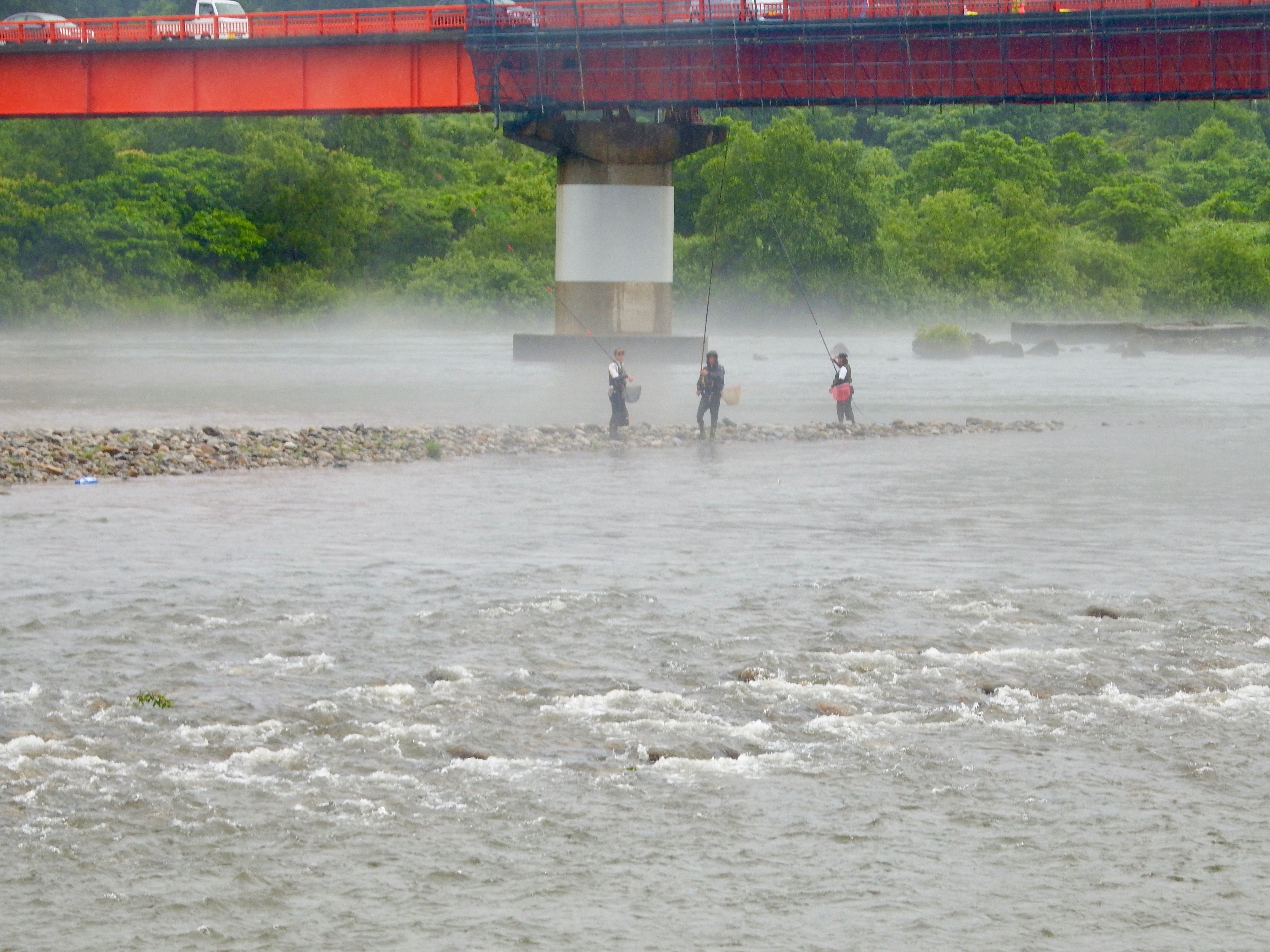 ikeさんです昨日、Dさんが女川に行っては見たが、ゴミなどが流れてきて釣りにならず1匹釣って宿に戻った。懲りずに頑張っていたのがM師匠とikeさんだ。早朝に宿に到着、支度して出かけて行った。息子が言うには「温泉橋の下で竿を出しているよ、写真撮っておいたから・・。」