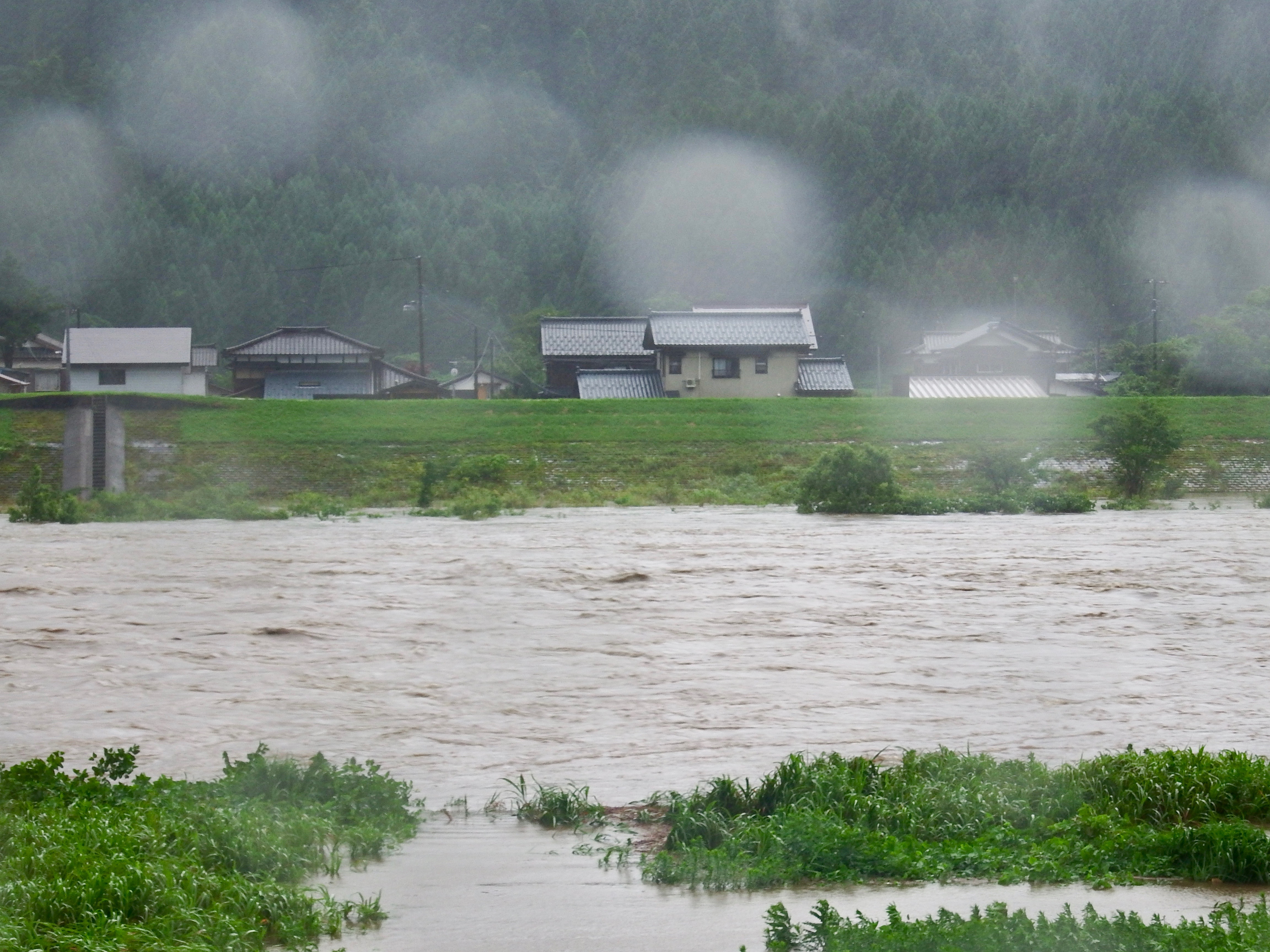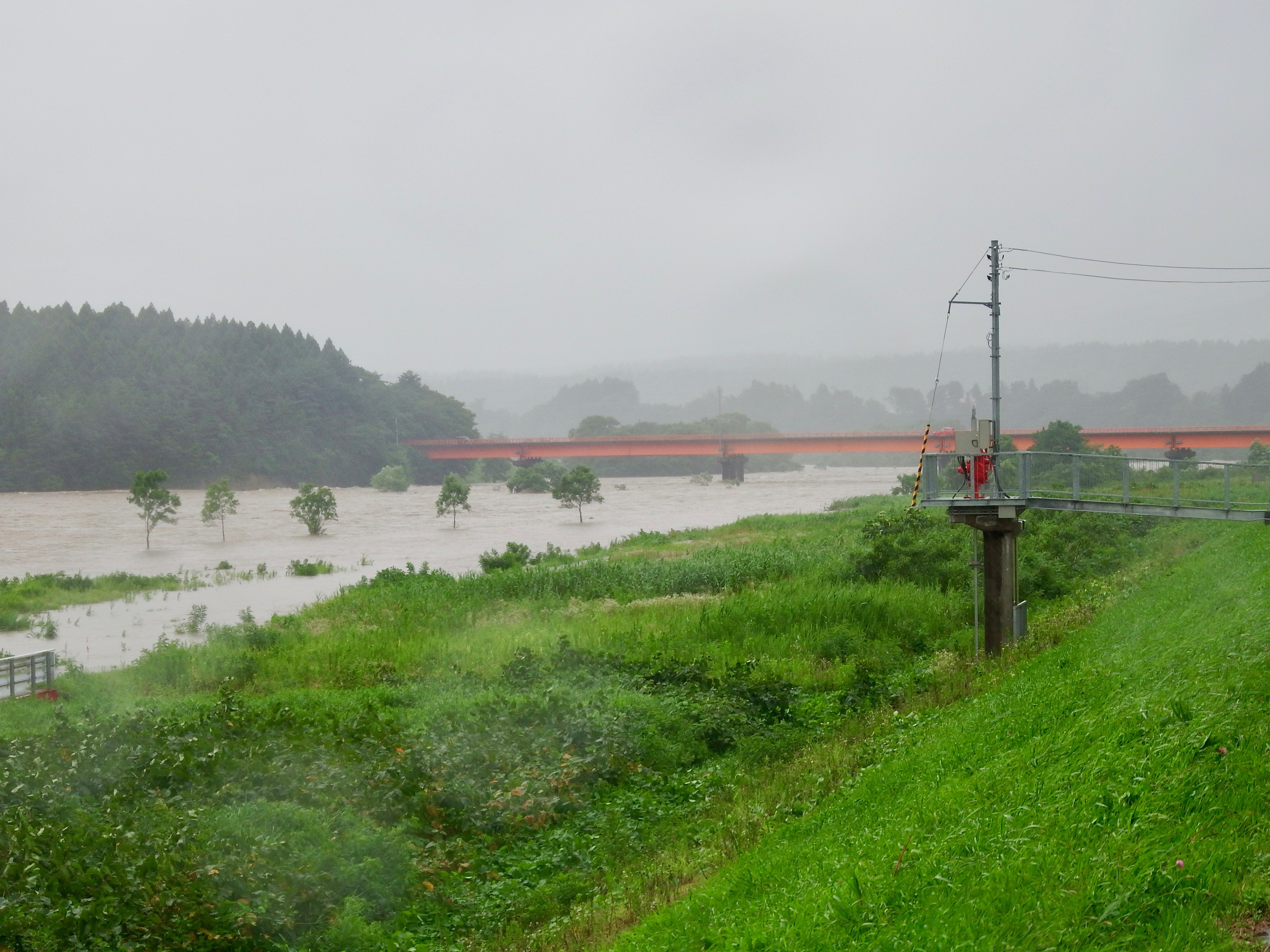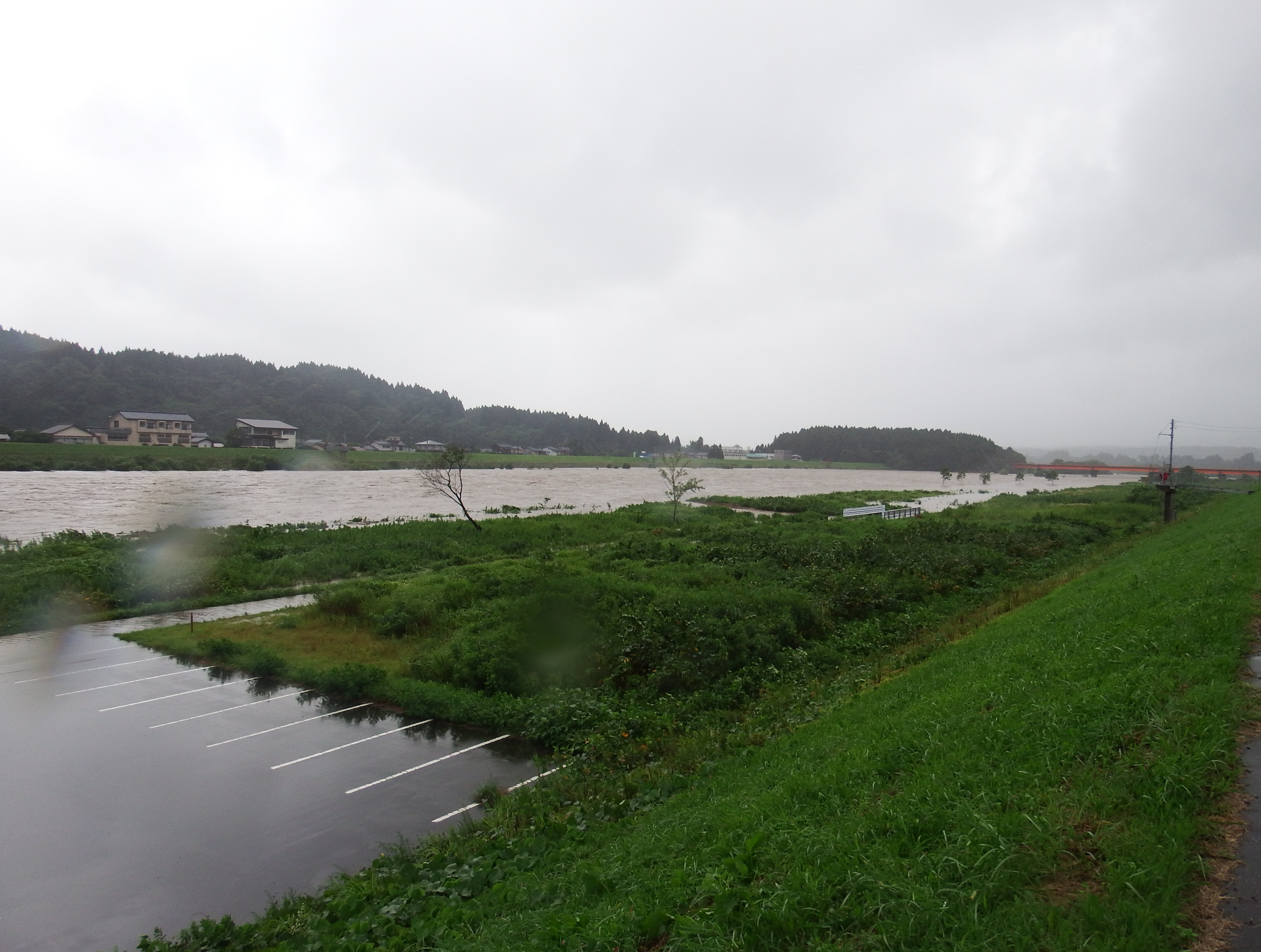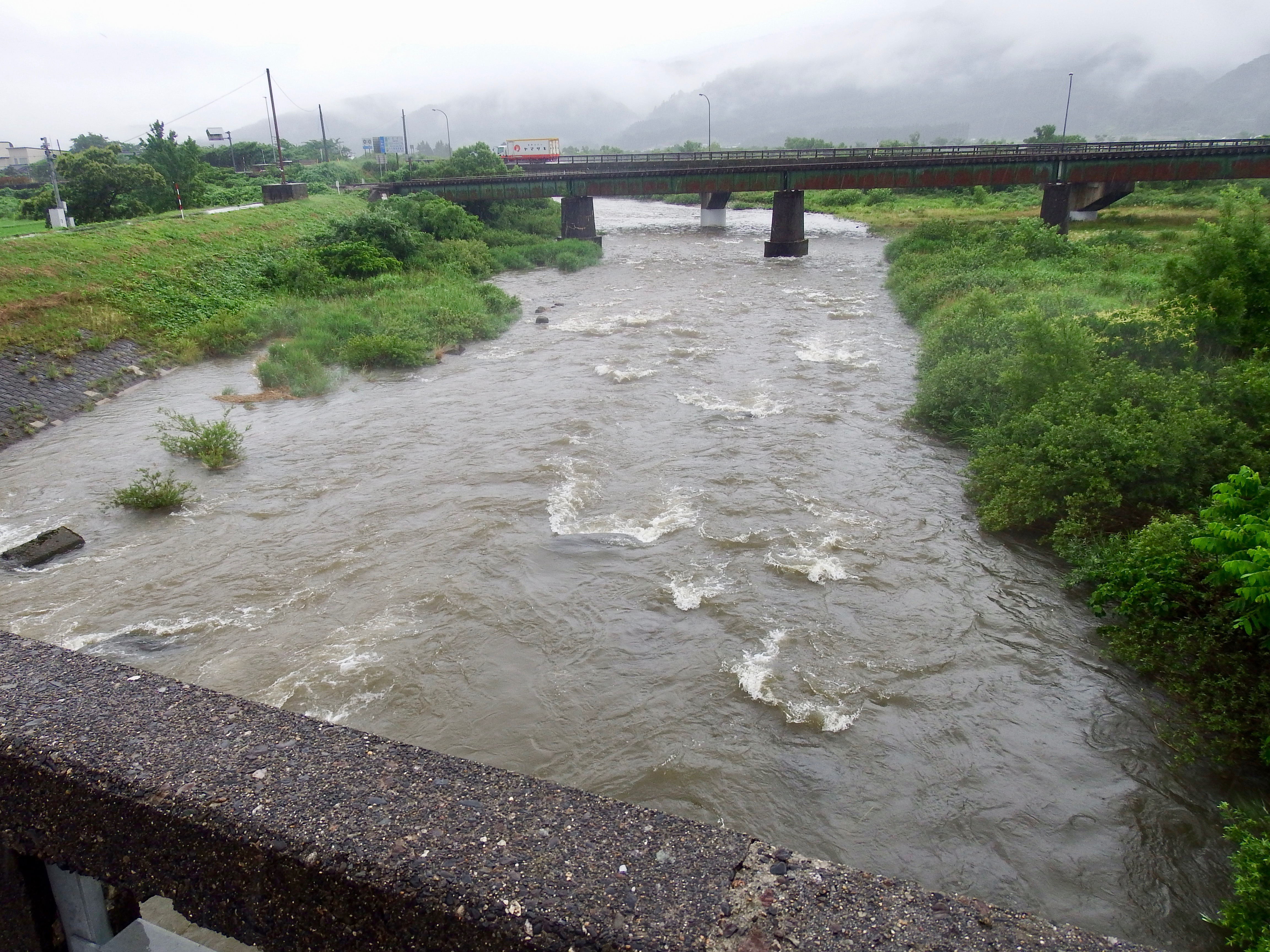 15日から降った雨は平水時より2m60cmも水位が高くなった。大石川も平時の20倍もの水量となってしまった。それに比べて女川の上流では雨量が少なく、わずかの増水で終わったので16日には釣り人が竿を出していた。長引く天候不順で鮎の成長が危うい。水温も低いままである。明日以降の日照りに期待したい。